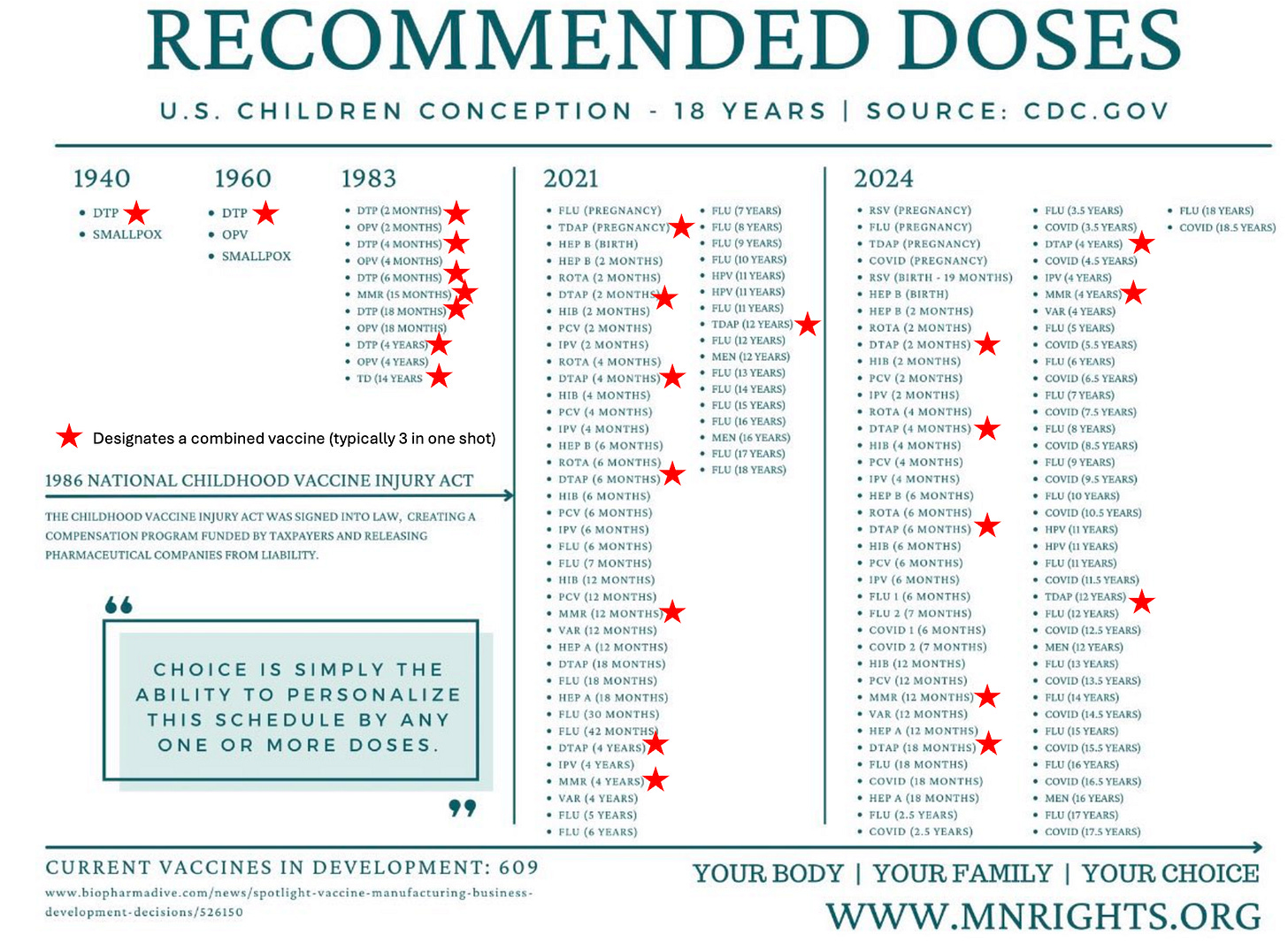 Note: the vaccine schedule has been repeatedly expanded since I first saw it in medical school (e.g., Hep A, HPV, and annual COVID-19 ones were added), but the relevant parts of it to this story have remained unchanged.