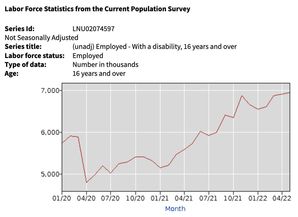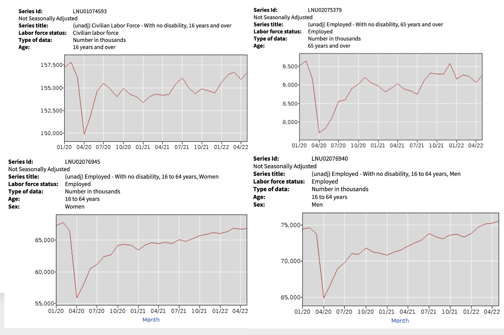 For comparison, let’s compare the above trends in employment to the changes in employment status for non-disabled individuals.