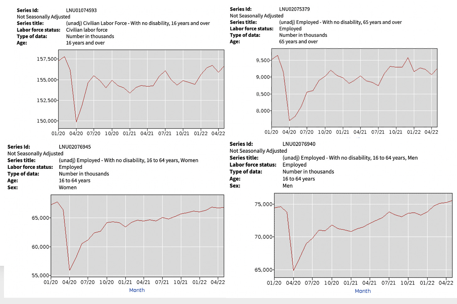 For those neither employed nor seeking work (classified as not in the labor force) and with disability, a clear trend appears. There was a brief drop in their numbers during the lockdowns (my best guess is that they either passed away during this period as this population is more susceptible to illness and stress, or started looking for work because they realized the lockdown no longer made it viable for them to remain unemployed). These changes leveled out, and factoring in seasonal variations of those “not in the labor force,” returned to baseline. Once the vaccination started, there was a 4.9% increase in the numbers of individuals not in the labor force (24005 to 25189) with disability.