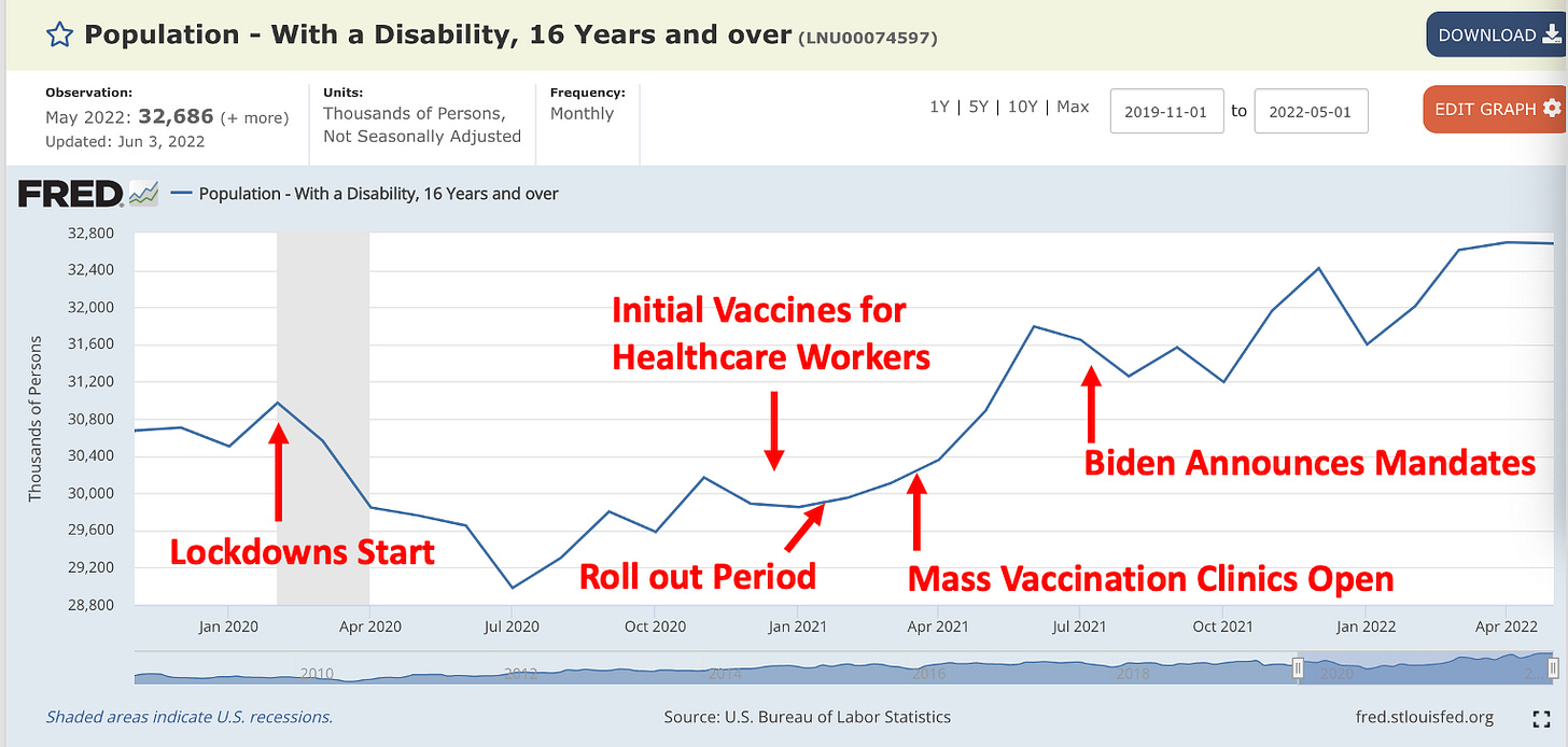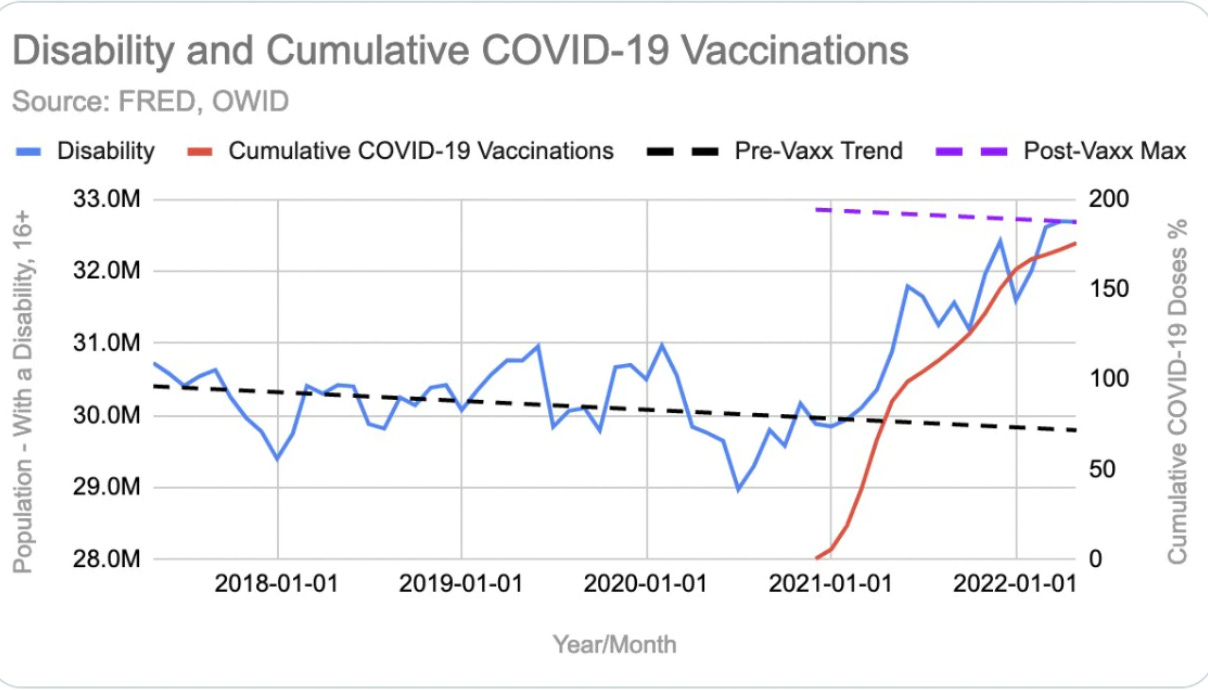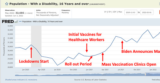 A few days ago I posted an article suggesting the mRNA vaccines were causing a spike in disability. Since that time the story has gone viral, I’ve had more time to look at the data, others have as well, and I now feel the case is very strong. Because this message is critically important, I am writing a second follow up article on the topic. In this article I will attempt to present a comprehensive analysis, and put the data into context with my experience of having worked with individuals with COVID vaccine injuries and individuals with varying degrees of disability including those seeking disability.