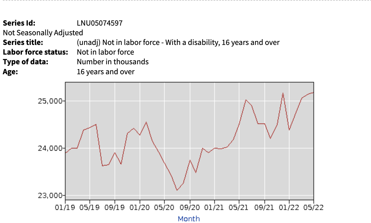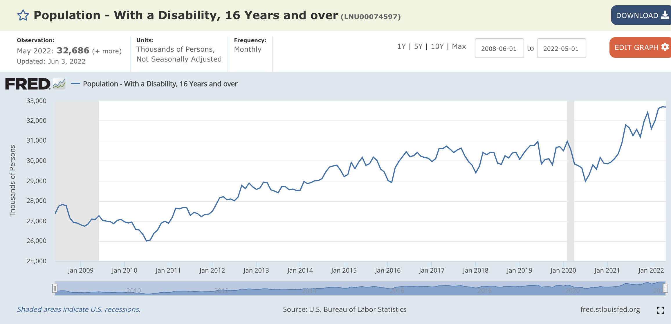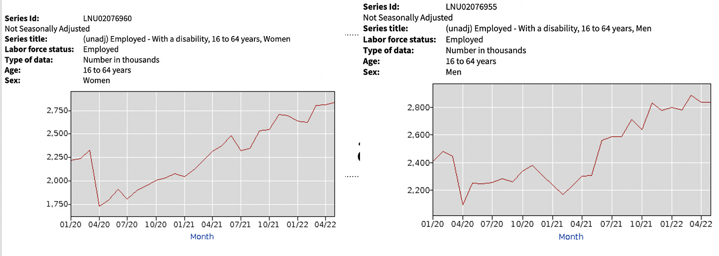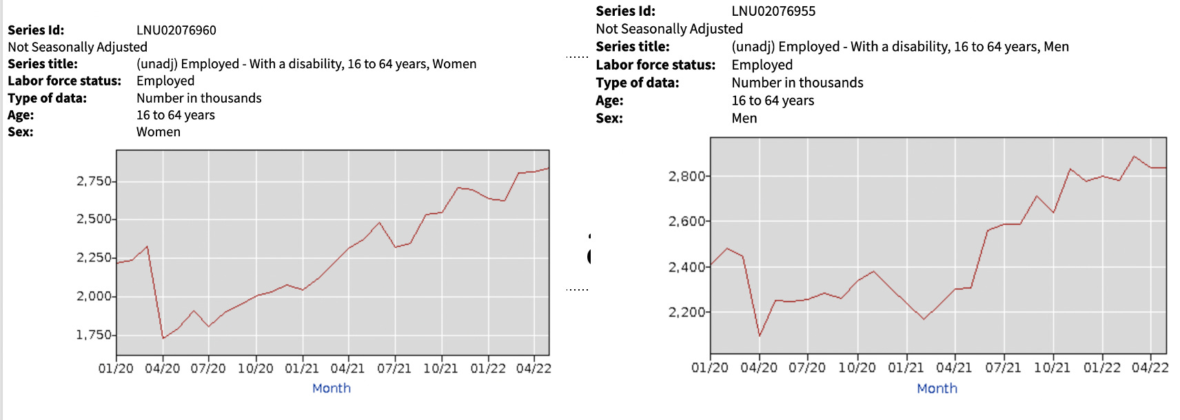 When we compare women to men, we see that women were faster to regain employment after the lockdowns (my best guess is they had a slightly easier transition to remote work). Once the vaccines entered the market, from Feb 2021 to now, there was a 34.1% (2,119,000 to 2,842,000) increase in disability amongst employed women and a 27.1% (2,236,000 to 2,842,000) increase from baseline of employed women with disability. For men, there was a 30.8% increase (2,166,000 to 2,834,000) after initiation of the vaccination campaign and a 14.1% increase from baseline (2,483,000 to 2,834,000).