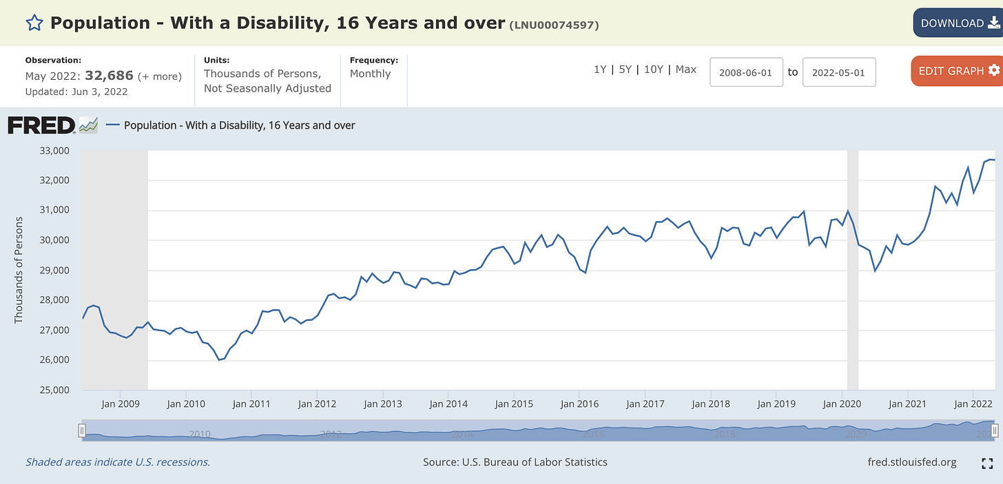 This data set is critically important because it will likely be one of the only ways to quantify the chronic complications of the Covid vaccinations on the American population. Likewise, I hope the case has been made that the Covid vaccines are the cause of this trend until proven otherwise.