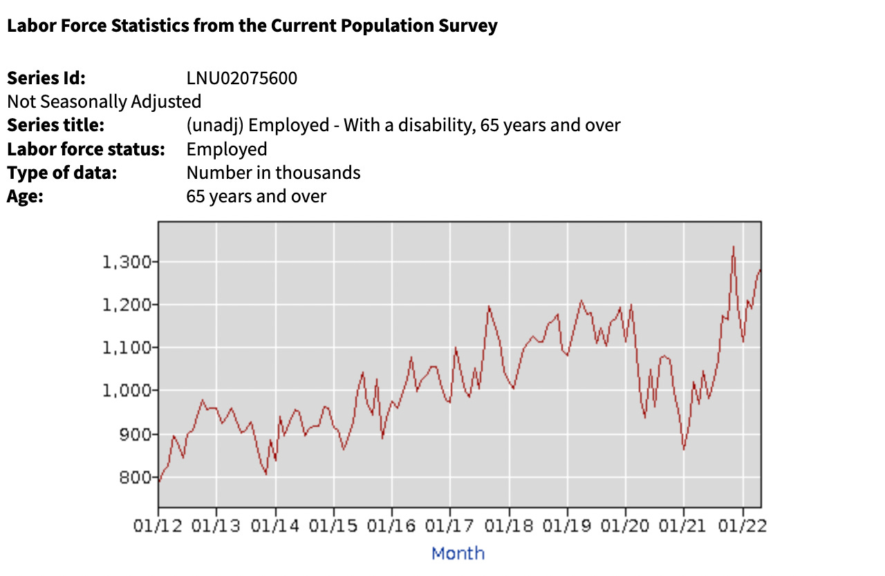 If we look at individuals over 65 who were employed, we see that there was an overall 15.5% increase (1,113,000 to 1,285,000) in disability. Additionally, this graph shows the sharpest trend in increases following the initial vaccine roll out, which makes sense since the elderly got the vaccines first and had a high vaccine uptake. In the space of 10 months we saw a 54.4% increase (865,000 to 1,336,000) in the rate of disability.