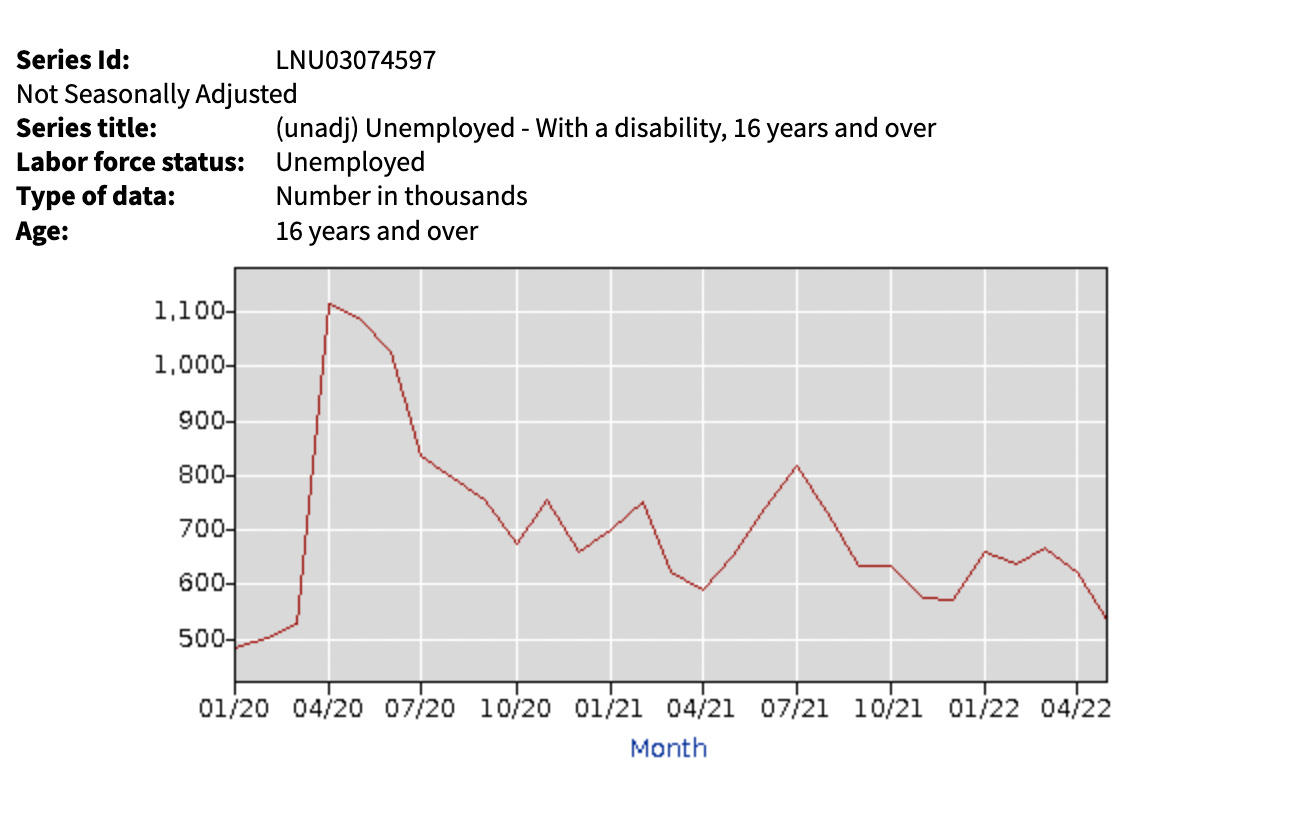 “Unemployed” is defined as not having a job but seeking work. A reciprocal relationship is seen between this and the previous dataset (keep in mind this represents approximately 10% as many people as the above one). An initial spike was seen in those unemployed with disability (since those who were employed and had disability lost their jobs due to the lockdowns), who then left this dataset once employment opportunities arose. Removing those who temporarily lost work, there was an increase from baseline in the number of unemployed individuals with disability, but it is much harder to discern the effect here. This is likely partly due to the fact unemployed individuals were not subjected to vaccination mandates.