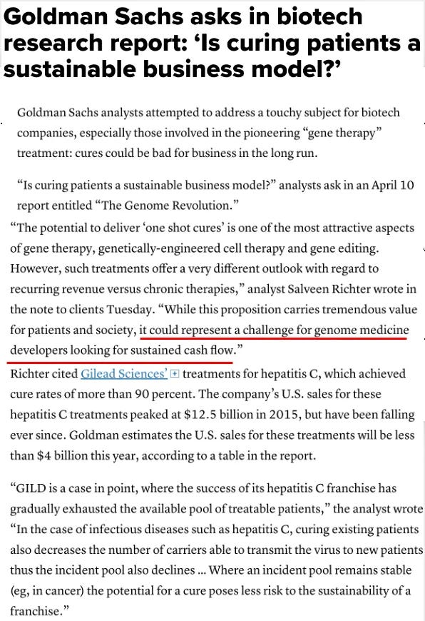 Because we operate in a pay-to-play system, it is nearly impossible to bring a drug to market unless it can be expected to recoup the cost it takes to do that. For example, if a drug is known to be safe, effective, and able to meet an unmet medical need but not have any scalability (as it treats the issue and does not require recurring administration) no one will fund the (fairly large) costs needed to get the drug to market. Many of us learned this first-hand during COVID-19 when we attempted to get approval for off-patent medications for treating COVID-19 (e.g., Steve Kirsch funded research that proved fluvoxamine was effective for treating COVID-19, but nonetheless could not get an emergency use authorization (EUA), and I encountered similar headaches with the FDA on the team I led—although we did not make is as far down the road as Steve’s team).