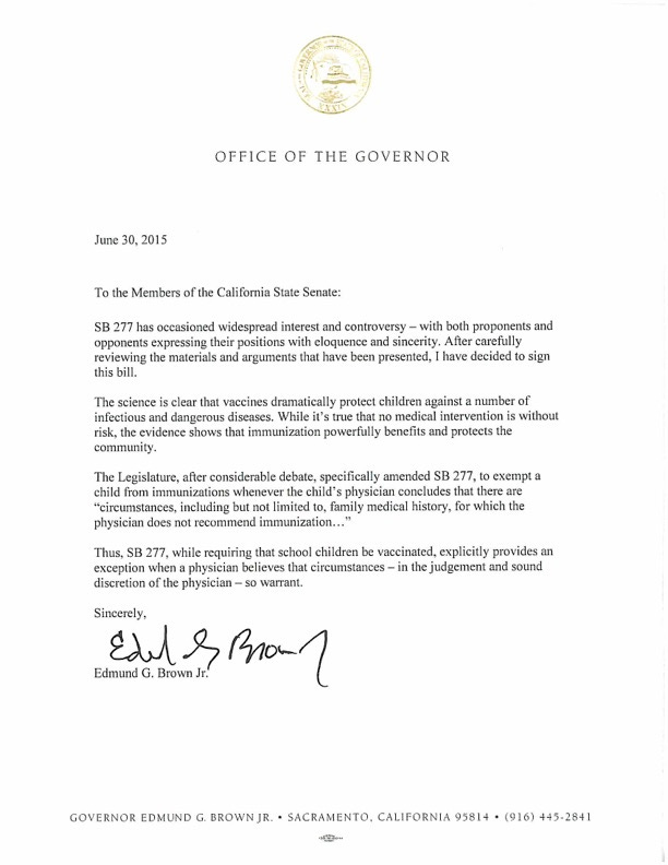 SB277 provoked mass political protest (many parents in California have vaccine-injured children and actively protested against mandates). After a divisive debate at the Capitol, the governor eventually signed the bill and stated in his signing message that SB277 had been amended to recognize that a variety of potential contraindications to immunization existed and the individual discretion of the child’s physician must be respected if the physician believes an exemption was appropriate.