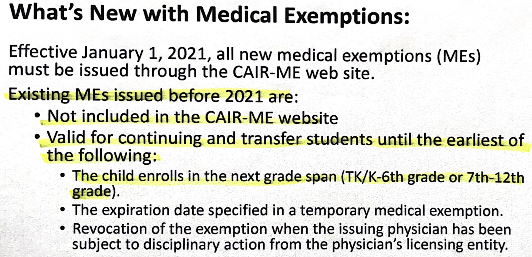 For example, in the previous article, I stated that a common issue parents run into is that when they transfer schools, their previous medical exemption is often no longer accepted, and while this is the case, I was informed that it is also violates California’s present guidelines (the image below is from CAIR, California’s vaccine registry) and is thus unacceptable:
