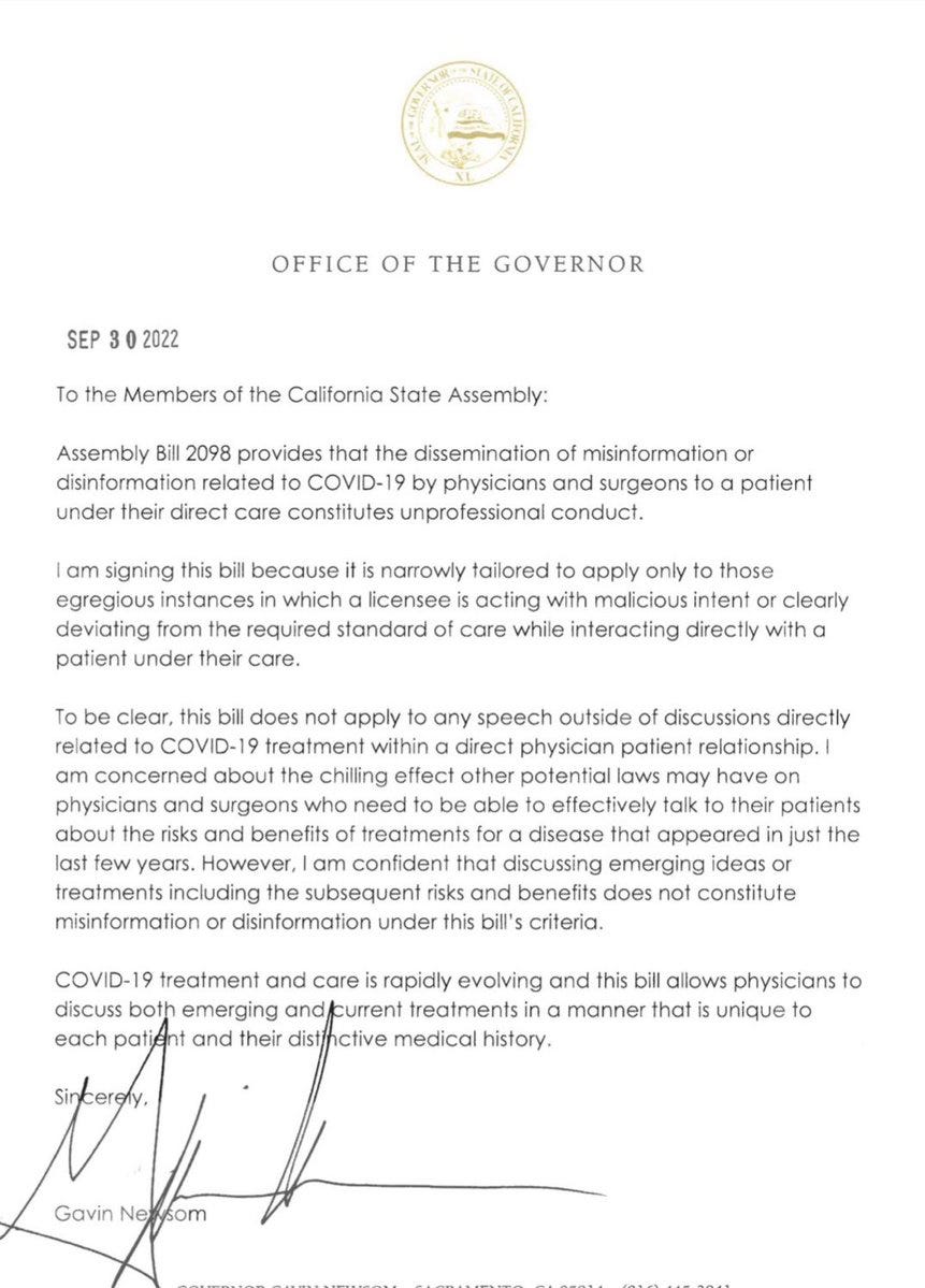 In summary, I would argue these quotations constitute outright lying (disinformation) by the California legislature. Were the circumstances not so grave, it would almost be comical that a law outlawing “misinformation” was itself full of it. Following the publication of this article, Newsom signed the bill into law. Now that I have provided the full context to this law, SB277 and SB276, I thought it would be helpful to provide Newsom’s signing statement so you can draw your own conclusions about it. Since I am not a lawyer, I cannot say this with certainty, but this statement does at least appear to qualify as misinformation (and possibly disinformation), so it will be interesting to reference back to it a few years into the future.
