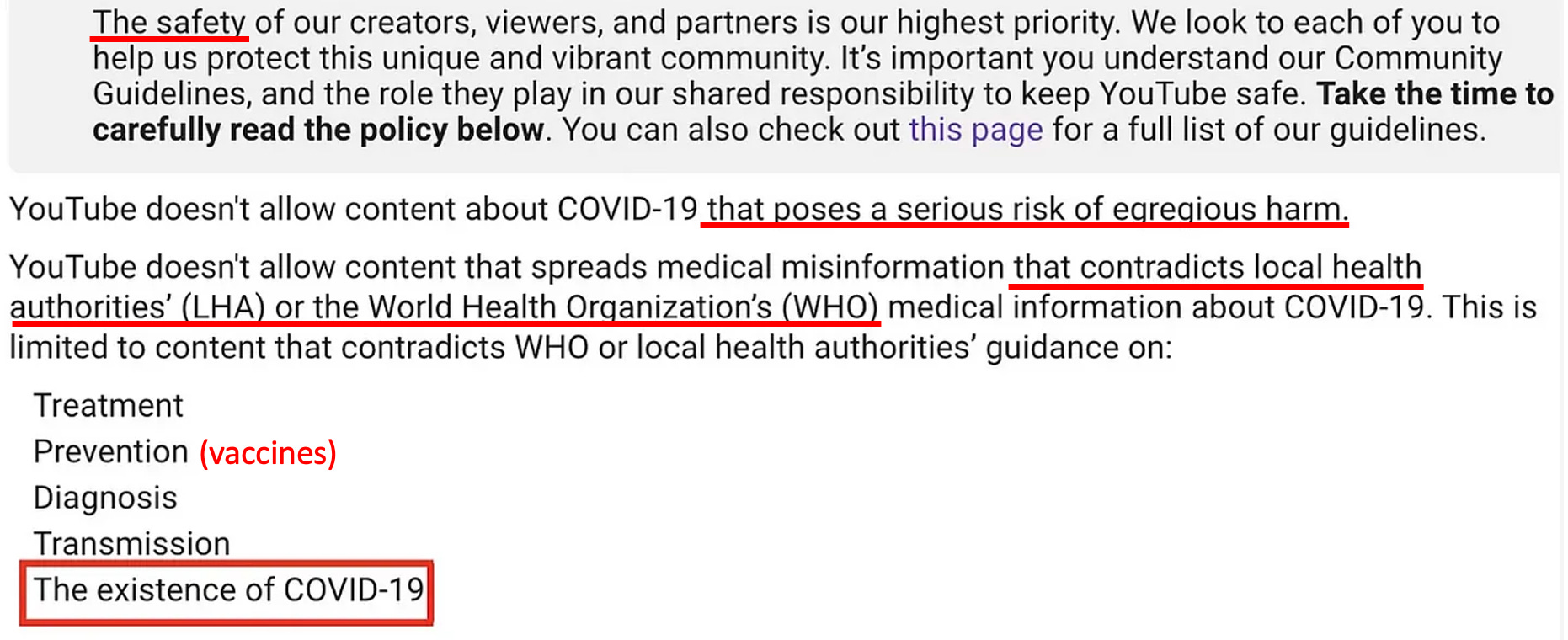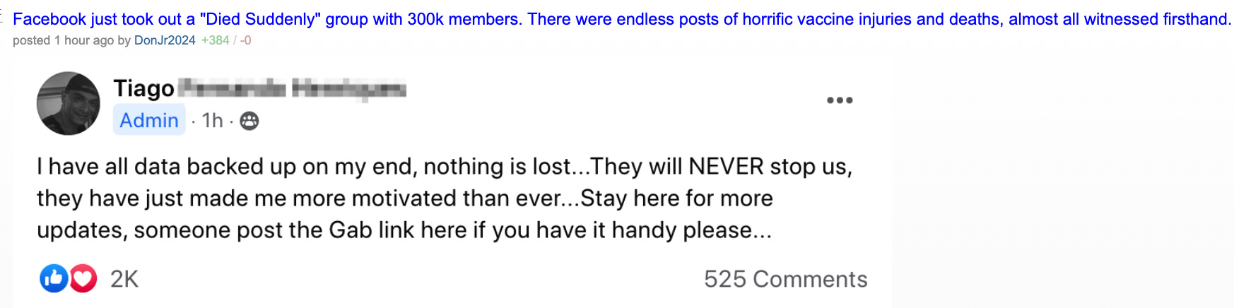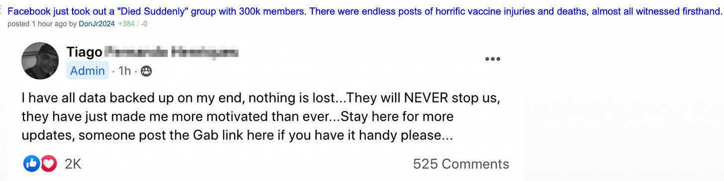 •Any references to vaccine injury. I remember multiple groups with hundreds of thousands of members (where individuals were receiving helpful advice for their injury) being deleted. This trend continues to the present day: