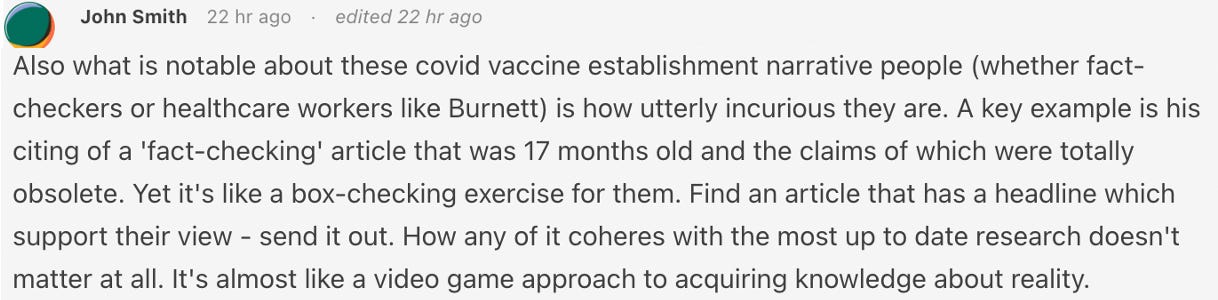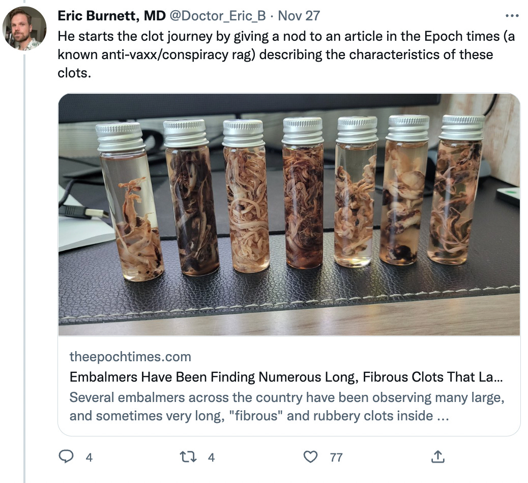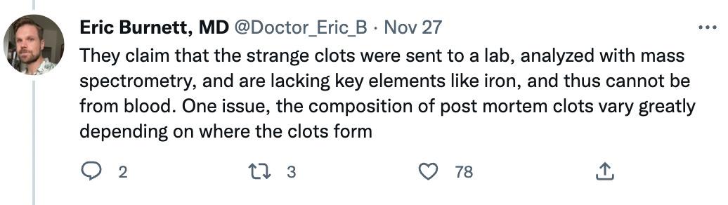 My reason for citing the article was because it had the only semi-detailed summary I had come across for describing their composition (as no one else wants to publish them) and thus, it had some clues we could consider to try to elucidate what was causing the clots. I am therefore not sure if this is the most appropriate approach to take to debunking my article. However, the common way that mentally lazy people debunk opposing claims is by attacking the messenger rather than the message, as it gives them a way to quickly sound smart and authoritative without needing to make the effort to understand an opposing viewpoint (as discussed in part 1). As a result, this type of debunking is irresistible, although I feel that overtly slandering The Epoch Times as a “rag” weakens, rather than strengthens Dr. Burnett’s credibility.