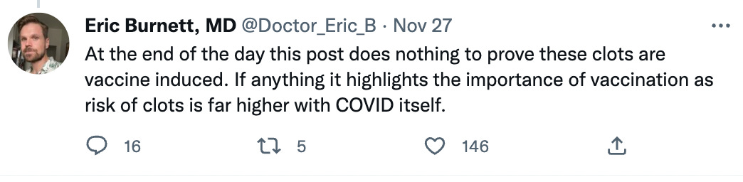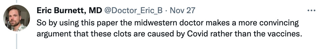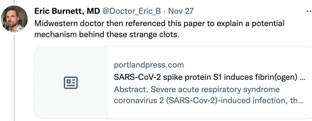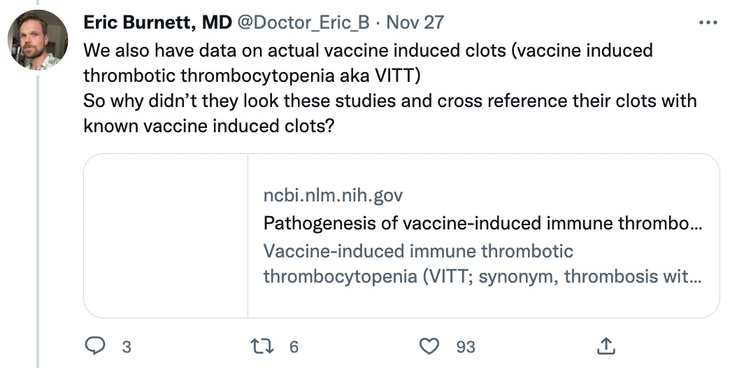 This is correct, and the reason why I did not heavily emphasize the article. Something I do not believe Dr. Burnett appreciates is that like other aspects of the pandemic, many laboratory owners have been asked to test the blood clots, but have been unwilling to publicize their data for fear of their lab going out of business in retaliation for doing so (I know specific instances of lab owners who stated this).