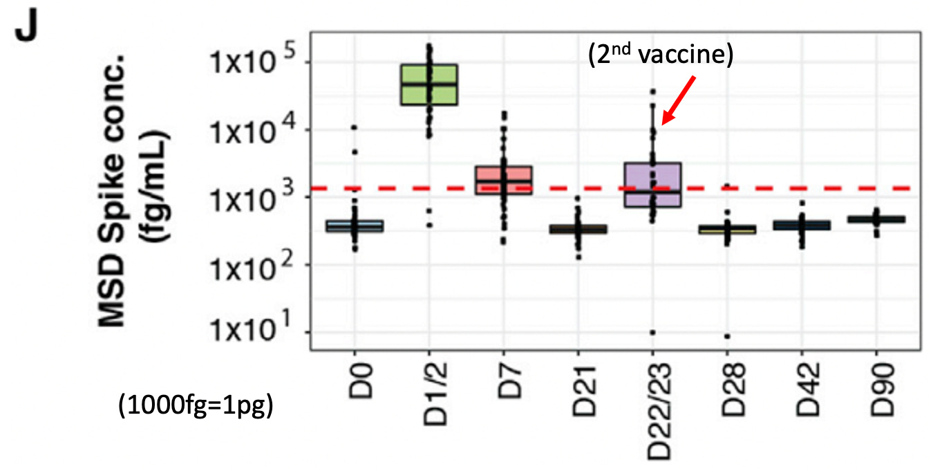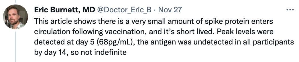 From this graph, it should be evident that the spike protein does not stop being produced at at least 70 days post vaccination. The authors of this study also noted that “our results are consistent with spike-specific antibodies blocking the detection of the antigen in antigen capture-based assays,” indicating that they were likely undercounting the amount of spike protein present (this also likely applies to the Simoa Assay used in the study Dr. Burnett cites). This suggests that some degree of the decline in spike protein presence in the blood analyzed in the study was not actually occurring (which is also consistent with the second vaccination creating a much smaller increase in circulating spike protein).