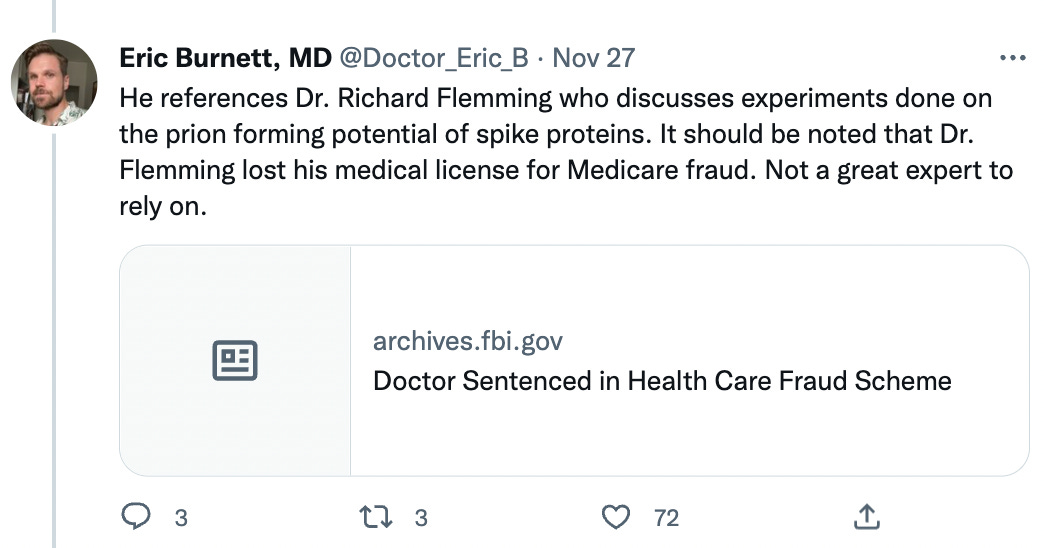 In most cases, this results in physicians who speak out against prevailing orthodoxies being those at or near retirement because they can afford to be professionally dismantled (I highly respect Pierre Kory because he is an exception to this rule who, for some reason, was compelled to speak out and bear the risk that it entails at the prime of his career). In addition to physicians near retirement, the other demographic who frequently speak out are those who were already blacklisted for something else (e.g., Paul Marik), and thus have much less to lose by speaking out. While I feel that what happened to Fleming was unfortunate, it was also a blessing for the vaccine safety movement as he was a uniquely qualified expert to assess this issue (M.D., J.D., Ph.D., Cardiologist, journal editor, and having an extensive background in inflammation and blood clots).