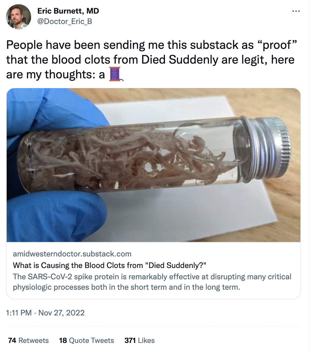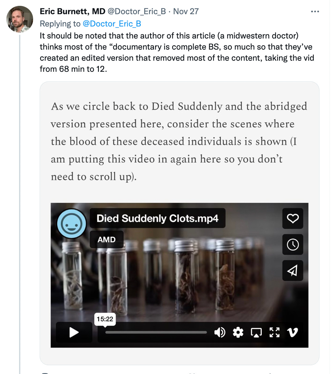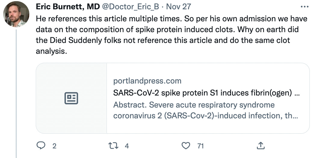Dr. Burnett inspired the previous article I wrote on Died Suddenly with this sassy Tik-Tok critique he posted of Died Suddenly. Due to his tone, he ruffled a lot of feathers in the vaccine safety community, but I felt he did make a few valid points that needed to be discussed. It should also be noted that Chris Martenson recently published a video on those clots that effectively debunked many of Dr. Burnett’s points (along with the views of a few other other fact-checkers), and discussed the model I put forward: