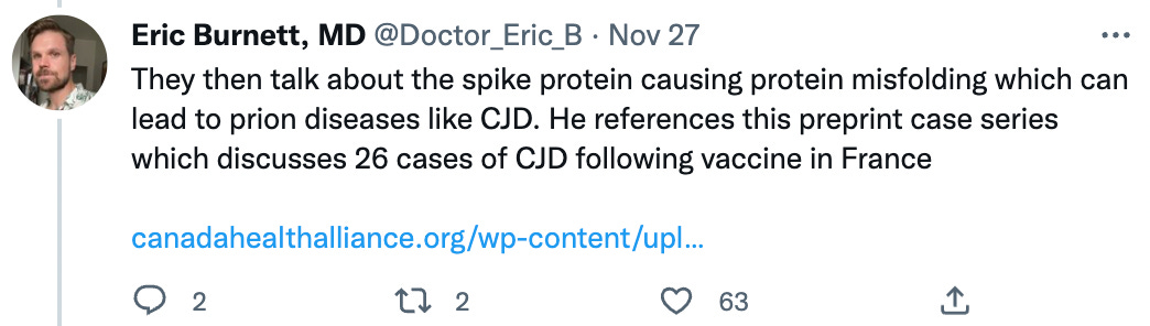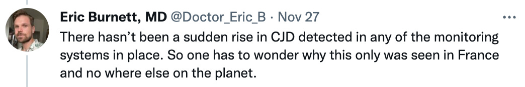 To address his first point, I believe the reason why 20 out of 26 of Montagnier’s cases were seen in France was that Luc Montagnier is one of the only researchers alive who would be willing to publish research like this which exposed him to such significant professional risk. Given that I had never heard of anyone discussing someone developing CJD before the COVID-19 vaccines, and I now know of three people, I am somewhat inclined to believe an increase has occurred.