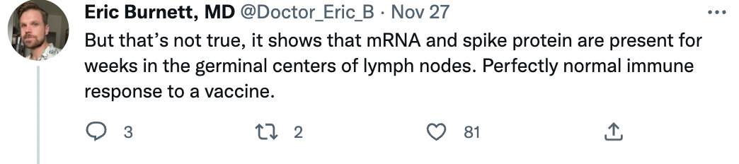 The second is that this claim ignores a study finding vaccine mRNA and spike proteins in the lymph node germinal centers for at least 60 days after vaccination (figure 7B on page 12 clearly shows this and suggests that the spike protein will persevere for much longer). To my knowledge, this is the only publicly available study that has investigated this question, which is quite frankly, obscene, as the manufactures should have been required to produce that data before their products were mandated on the population.