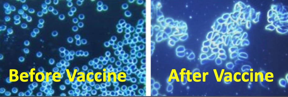 This above slides are from this study of 1006 patients who developed symptoms after spike protein vaccination, of which 948 (94%) had abnormal blood. 12 of those who developed abnormal blood were also examined prior to vaccination.