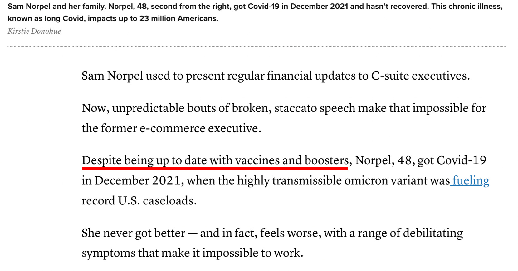 Long-haul COVID is very much a real thing (e.g., I’ve had a few patients who developed it after COVID-19, long before the vaccines entered the market and if it’s not treated, it has a significant adverse impact on your life). This condition was initially used to market the vaccines (both to prevent you from getting it and to treat it if you had it), and I know many people now where it failed to do either (e.g., a friend and two of my friends’ patients had a partial impairment from long-haul COVID, got the vaccine and then became much less able to function). I believe failures like those I have observed account for why vaccine pushers do not cite this argument as frequently now (the same of which can be said for many other claims that were previously used to market the vaccines).