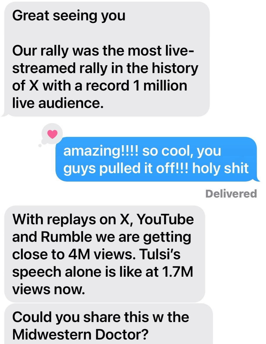 Third, I like to feel what I’m doing is meaningful. For example, when the Rescue the Republic Rally was announced I realized that it would be critical to effectively promote it on Twitter, so I reached out to the organizers for some resources and then worked with The Vigilant Fox to do just that. Then on Weds, Pierre Kory received this message from one of the organizers and forwarded it to me (who wanted me to share the rally with the readers here):