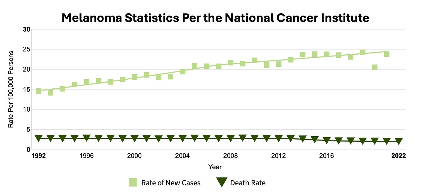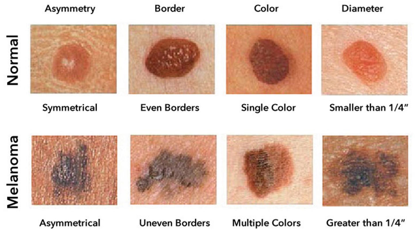 Melanoma is estimated to occur at a rate of 218 cases per million persons in the United States each year (with the risk varying by ethnicity). However, despite only comprising 1% of all skin cancer diagnoses, Melanoma is responsible for most of the deaths from skin cancer. Since survival is greatly improved by early detection, many guides online exist to help one recognize the common signs of a potential melanoma: