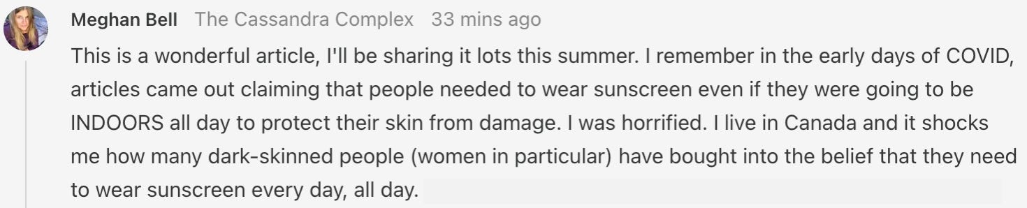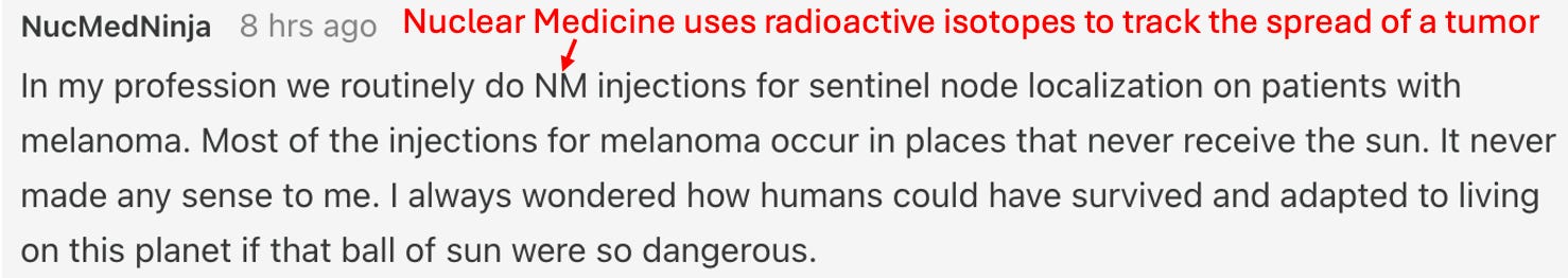 Once I became a medical student (at which point I was familiar with the myriad of benefits of sunlight), I was struck by how neurotic dermatologists were about avoiding sunlight—for instance, in addition to hearing every patient I saw there be lectured about the importance of avoiding sunlight, through my classmates, I learned of dermatologists in the northern latitudes (which had low enough sunlight people suffered from seasonal affective disorder) effectively require their students to wear sunscreen and clothing which covered most of their body while indoors. At this point my perspective on the issue changed to “this crusade against the sun is definitely coming from the dermatologists” and “what on earth is wrong with these people?” A few years ago I finally learned the last piece of the puzzle through Robert Yoho MD and hence was inspired to write this entire article.