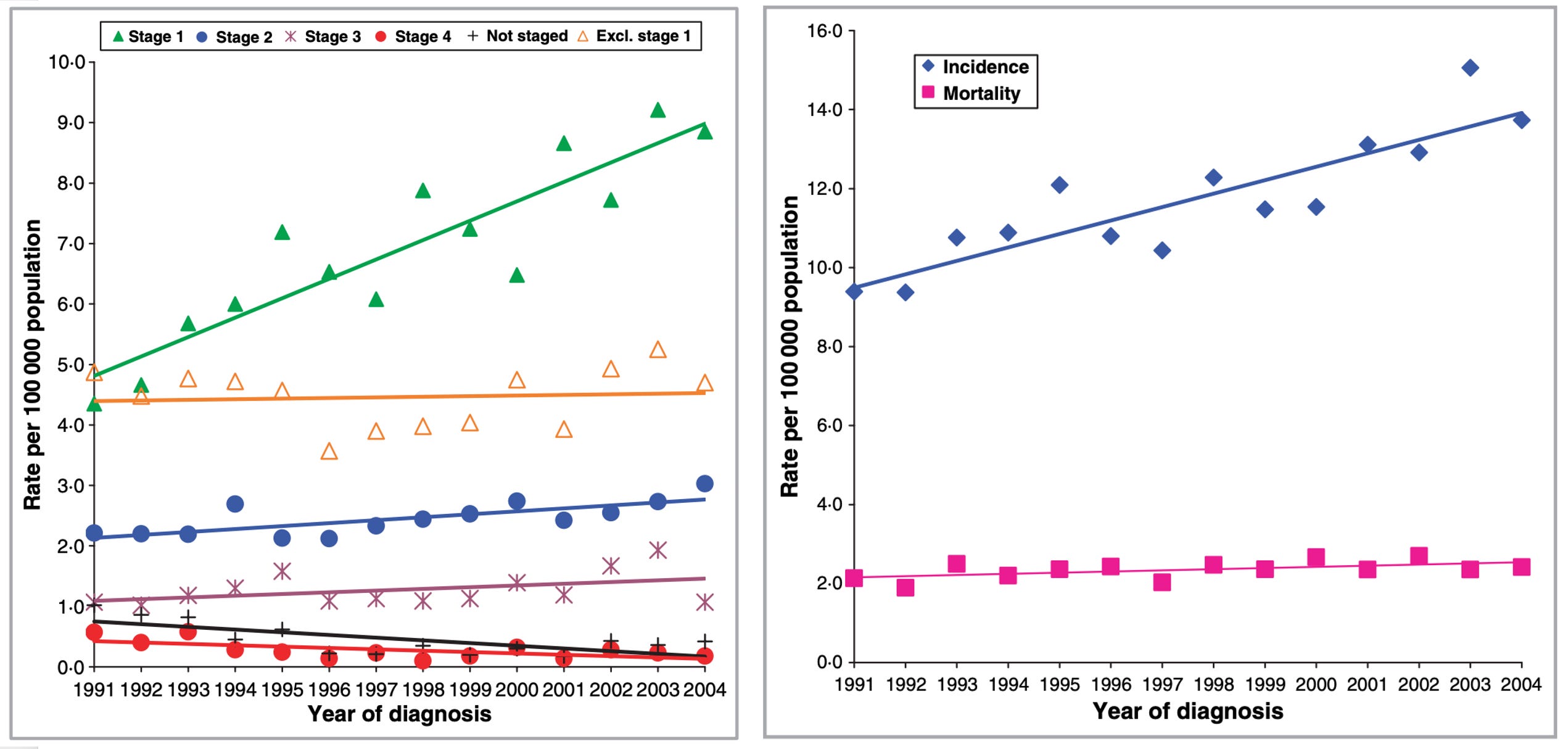 The best proof for this came from this study which looked at what type of malignant melanoma was actually being biopsied, and found that almost all of the increase in “skin cancer” were the stage 1 melanomas which rarely created problems: