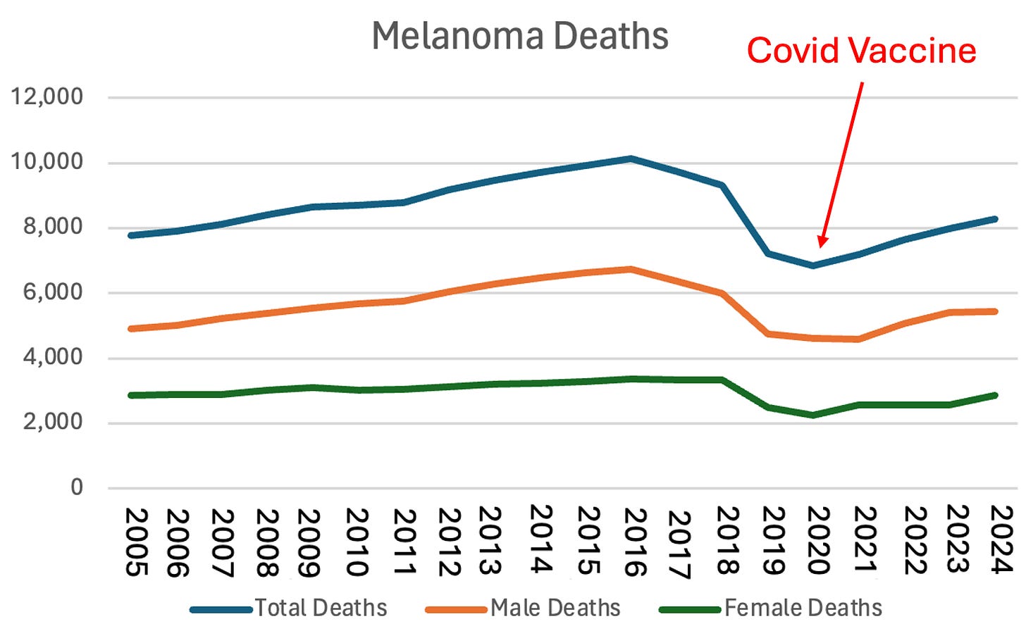 Finally, since many suspected the COVID vaccines might lead to an increase in melanoma (or other skin cancers), and I could not find the statistics for that online, I decided to create them by compiling all the available annual reports from the American Cancer Society into a few graphs: