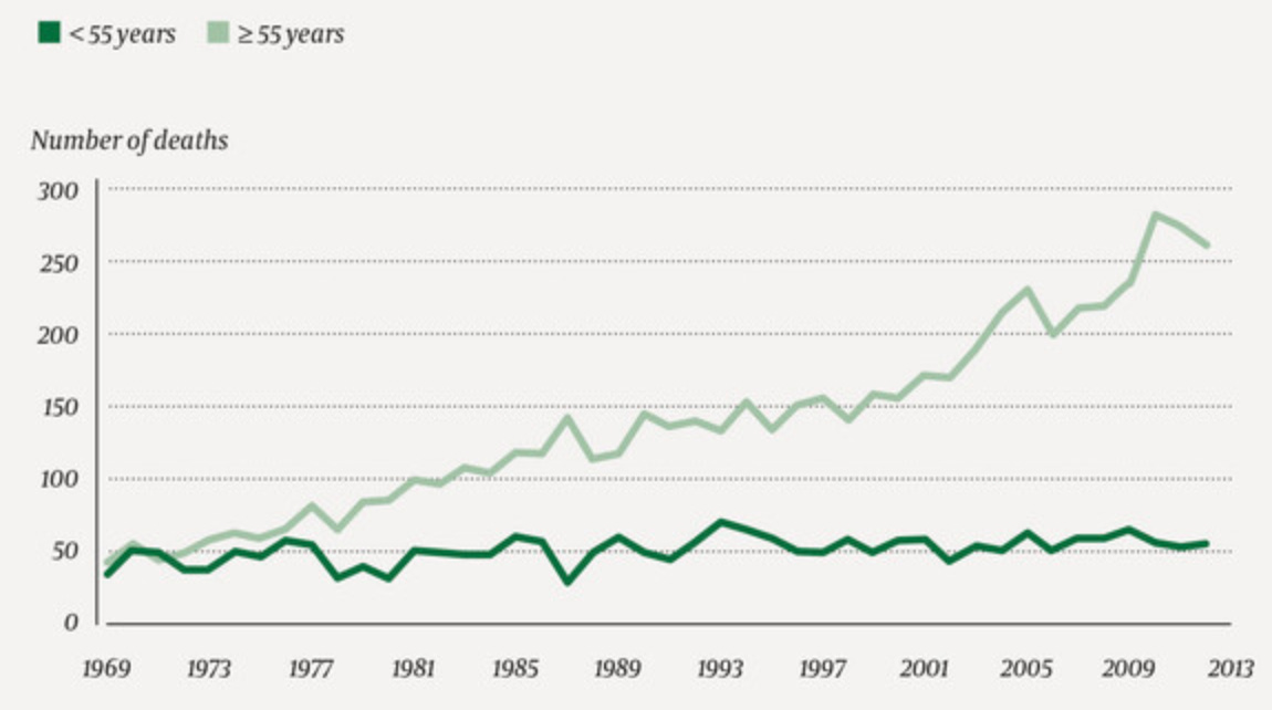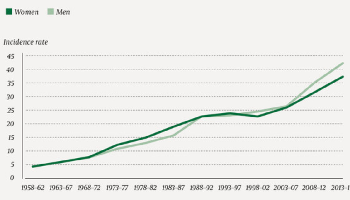 •There has been a significant increase in many areas from melanoma, something which argues against sunlight being the primary issue as it has not significantly changed in the last few decades. For instance, consider this data from Norway’s cancer registry on malignant melanoma: