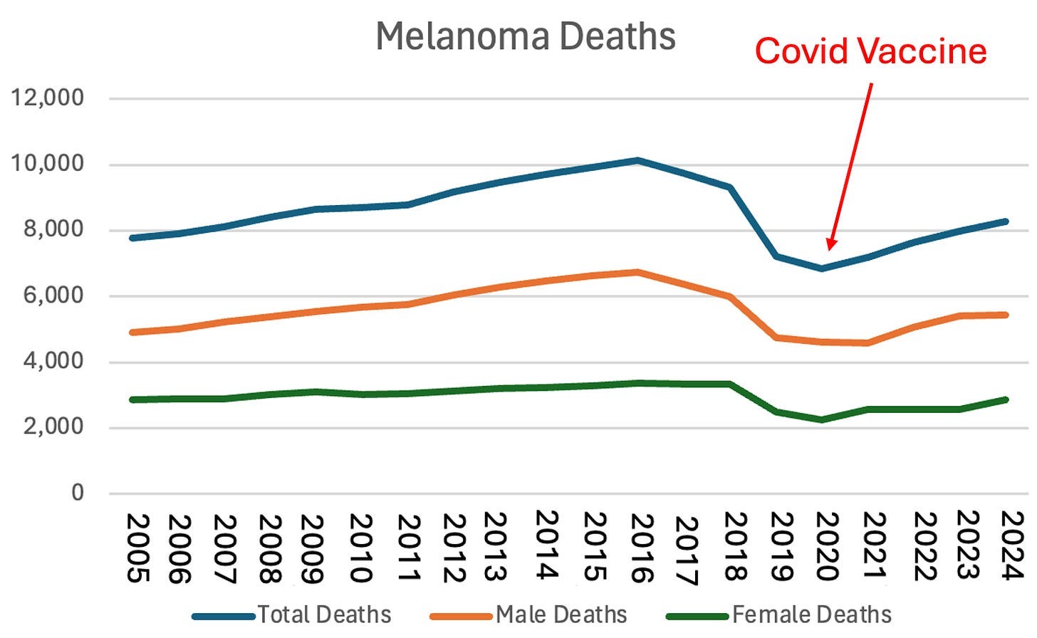 Finally, since many suspected the COVID vaccines might lead to an increase in melanoma (or other skin cancers), I compiled all the available annual reports from the American Cancer Society into a few graphs: