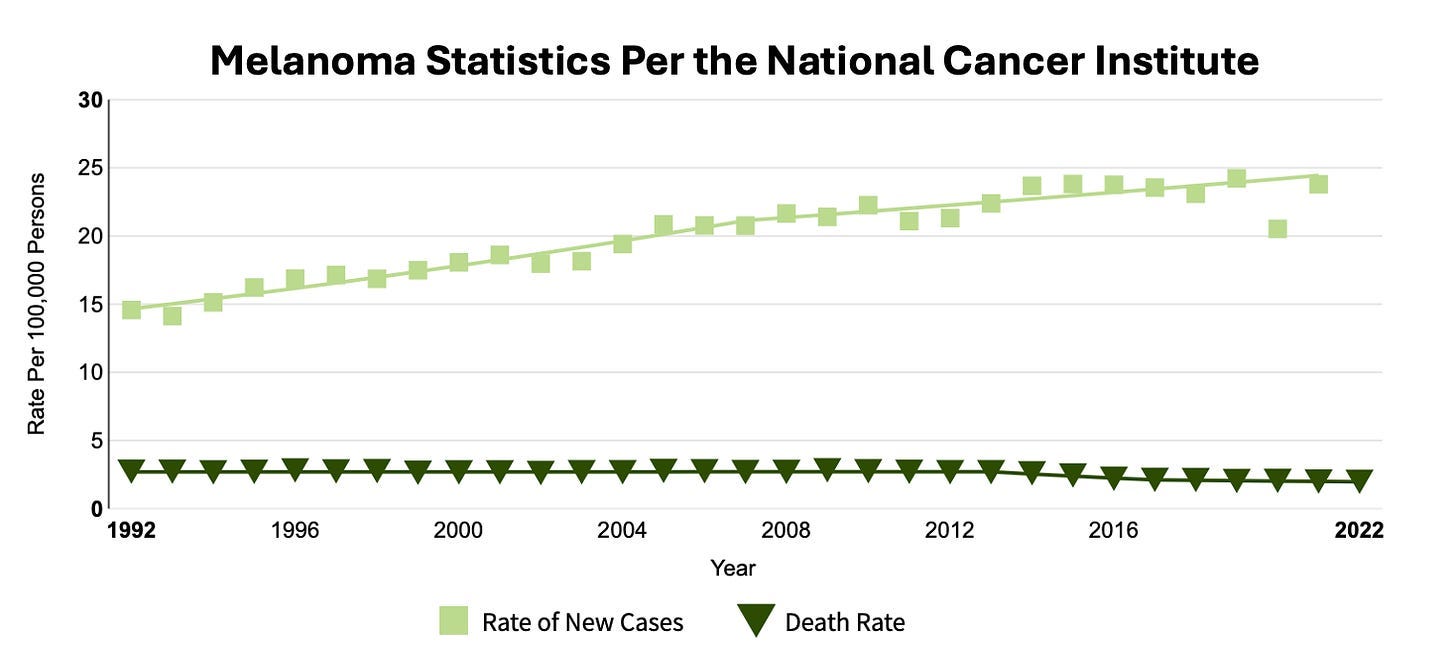 Melanoma occurs at a rate of 218 cases per million persons annually in the United States, with survival rates ranging from 99% to 35% depending on its stage when diagnosed, averaging out to 94%. However, despite only comprising 1% of all skin cancer diagnoses, Melanoma is responsible for most skin cancer deaths. In total, this works out to a bit over 8000 deaths each year in the United States. Since survival is greatly improved by early detection, many guides online exist to help recognize the common signs of a potential melanoma.
