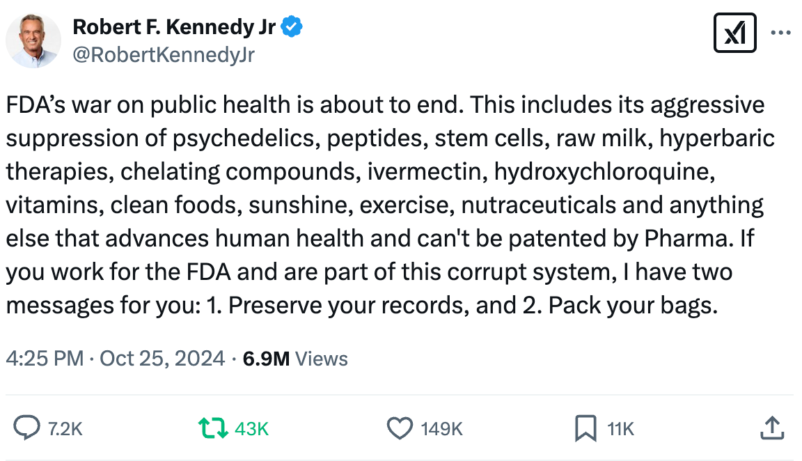 Unless you have an inside view of the system, it’s difficult to appreciate how improbable someone like RFK Jr. being nominated to run H.H.S. is (let alone being confirmed) as so many vested interests see that as an existential threat. Because of this, I’ve put a lot of thought into all the moving parts and if there was anything I can do that would tangibly improve his chance of success.
