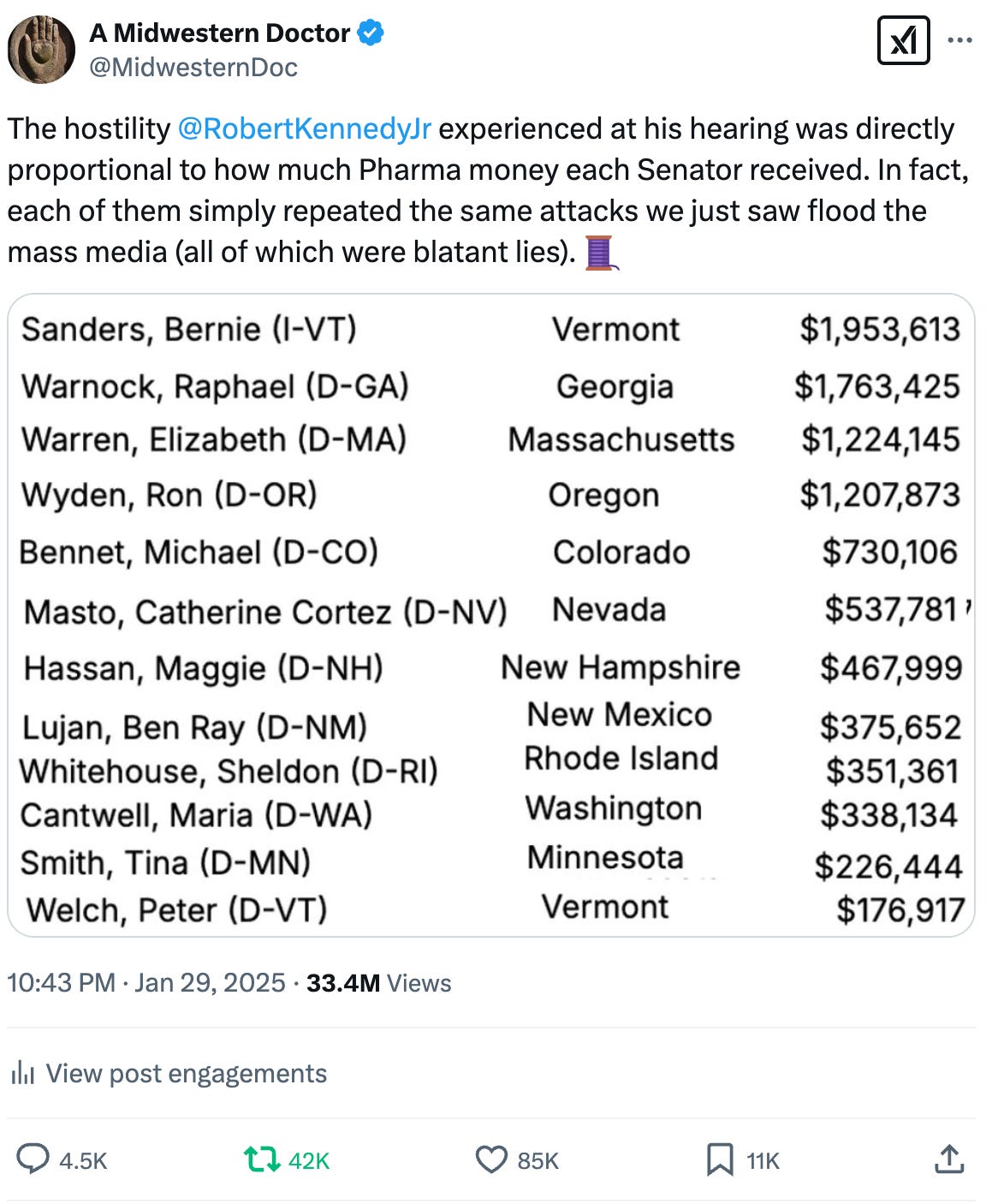 Note: it was also amazing at the RFK Jr. hearings (especially the later ones) to hear so many Republican senators directly challenge the misleading frames the medical industry has used for decades to take advantage of us.