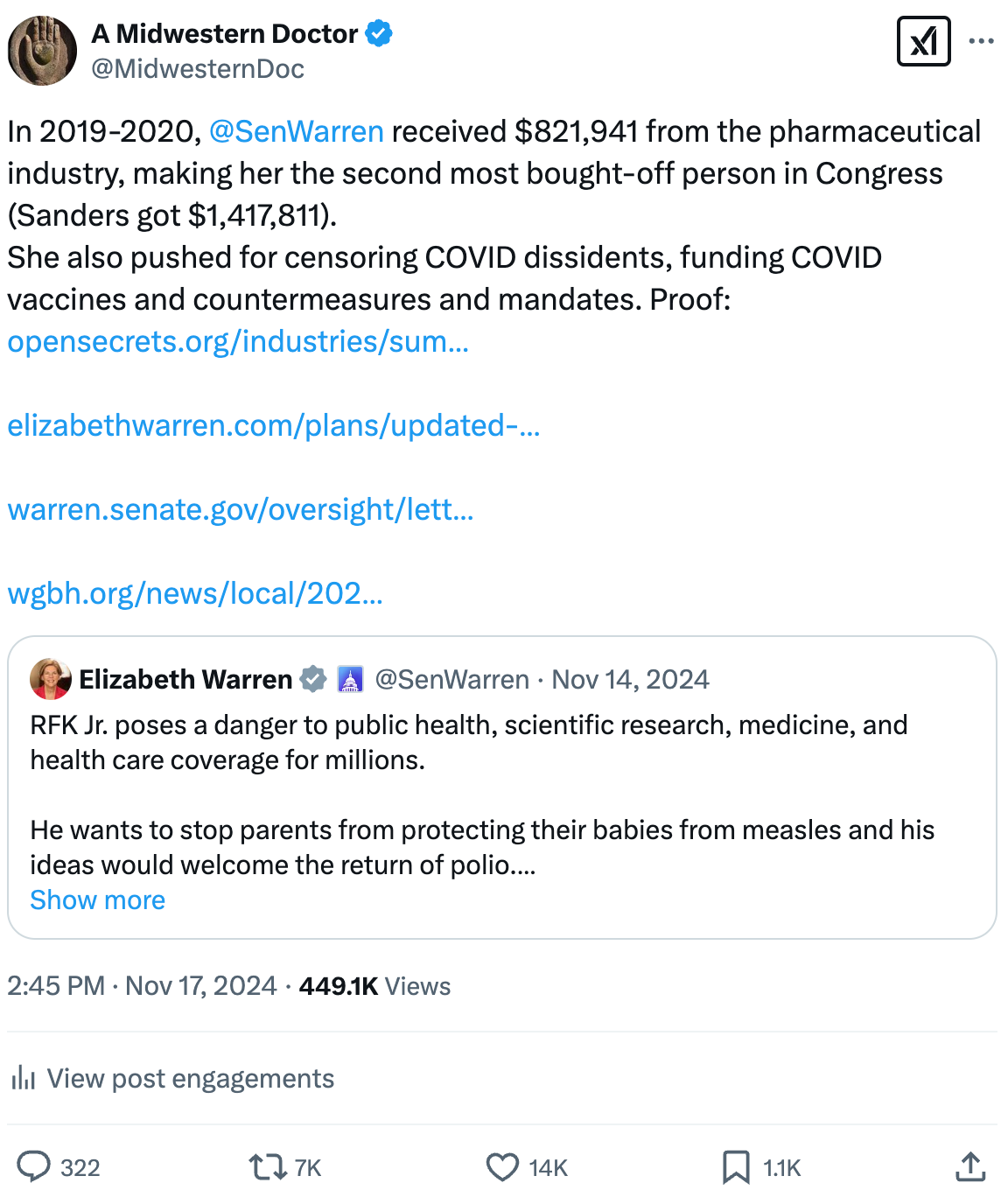 Following this, I then tried to get this out there a few more times (which got similar degrees of traction) and noticed that more and more commenters were pointing it out to Warren as well. In parallel, I also started trying to lay out a comprehensive picture of both the corruption within the FDA (which for over a century has prevented dedicated and beloved civil servants from being able to fix anything) and to dissect the entire campaign being waged against RFK so more people knew how to opposed to it.