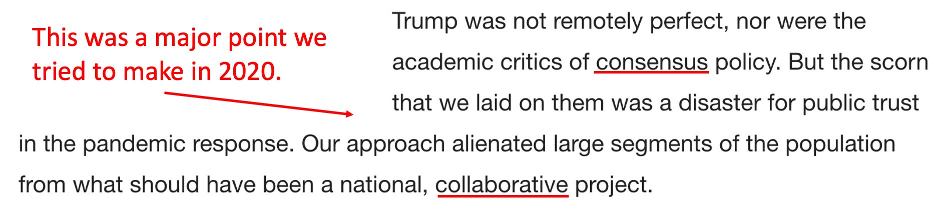 That was of course not what happened, and I believe many of the disasters we faced could have been avoided if an actual collaborative model had been followed (rather than being forced to follow someone else’s consensus). Instead, we saw a situation where everyone tried to take advantage of the situation for their own benefit. One of the things I find interesting was that although Trump had almost no public health knowledge, the policies he tried to push forward were dramatically better than almost anything the experts put forward.