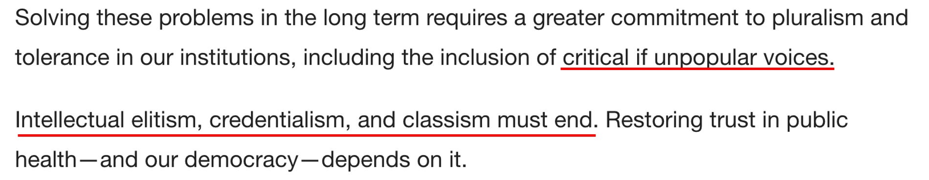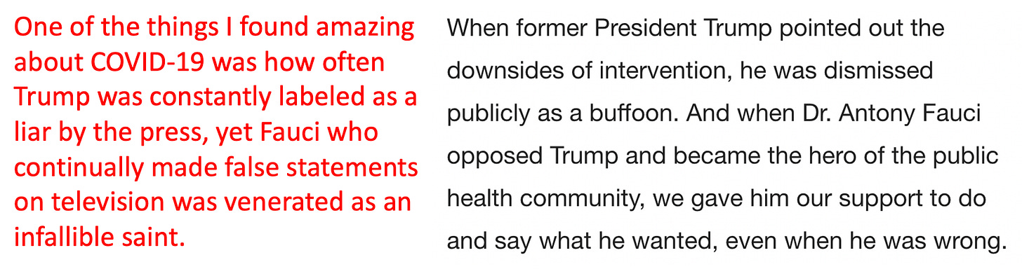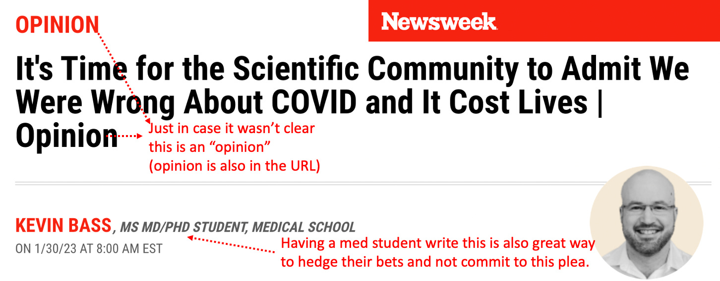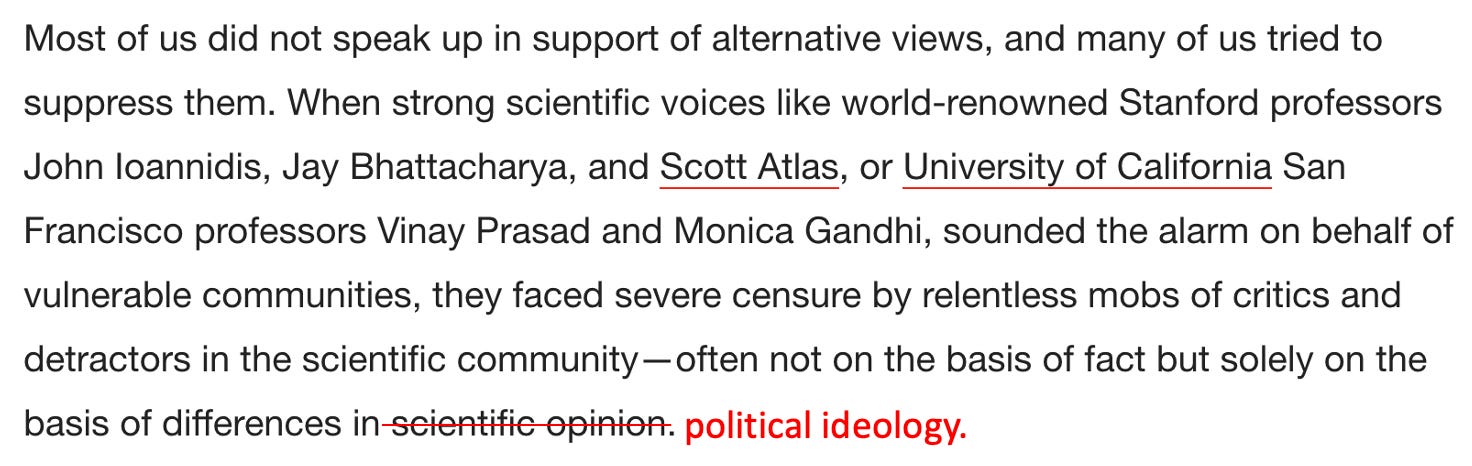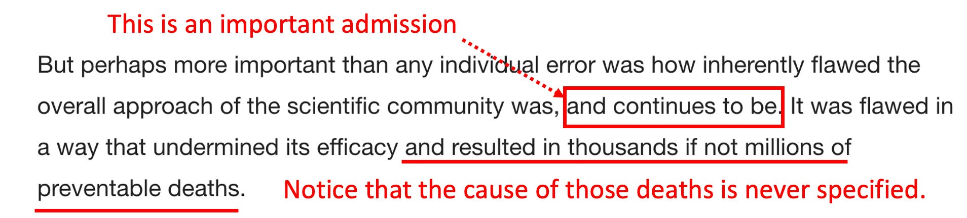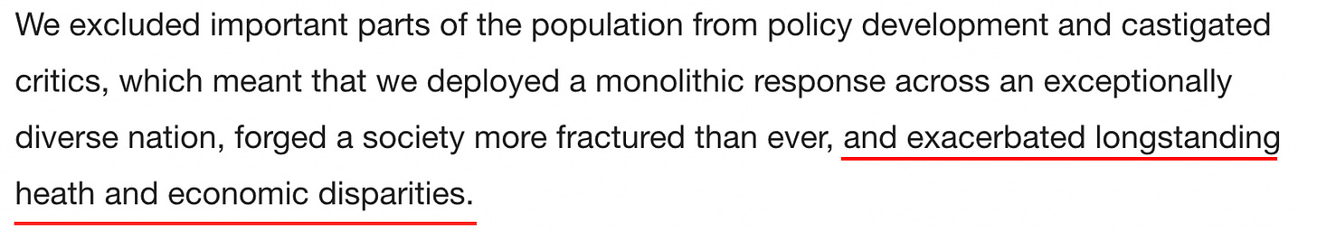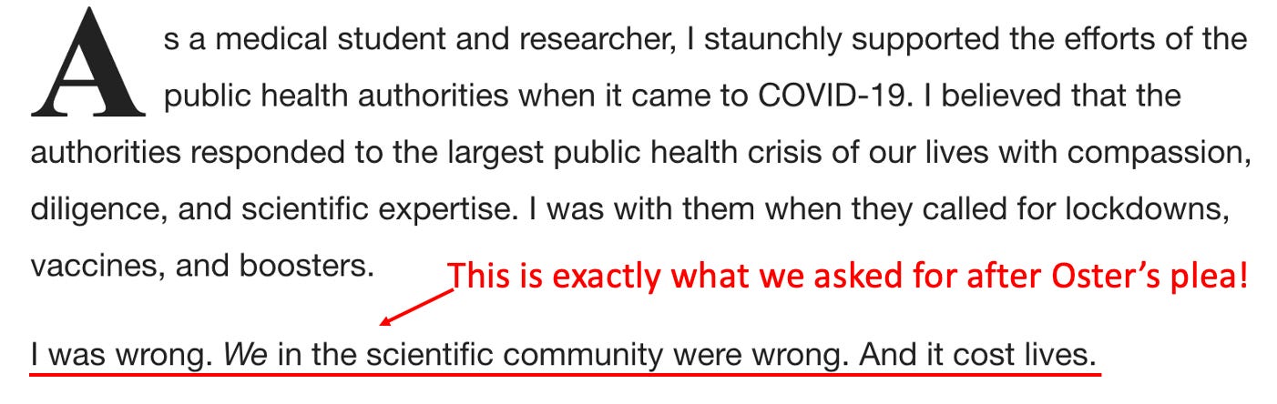 Before we go any further, I want to be clear that this piece, like Oster’s (who was also not a doctor), was primarily written for an educated liberal audience (hence why it uses so many of the academic constructs they love). I believe the goal of this piece is to test out soundbites that could be used to address the major issues that the medical establishment has created for itself as a result of how it handled COVID-19. The goal essentially is to have their cake (say something nice that makes everyone happy) and eat it (not have to actually admit what they did wrong or relinquish any of their power by changing the core problematic policies they put forward).