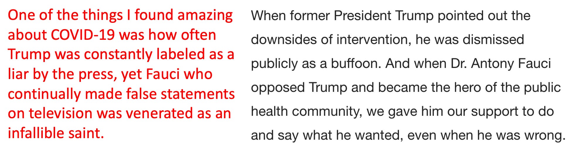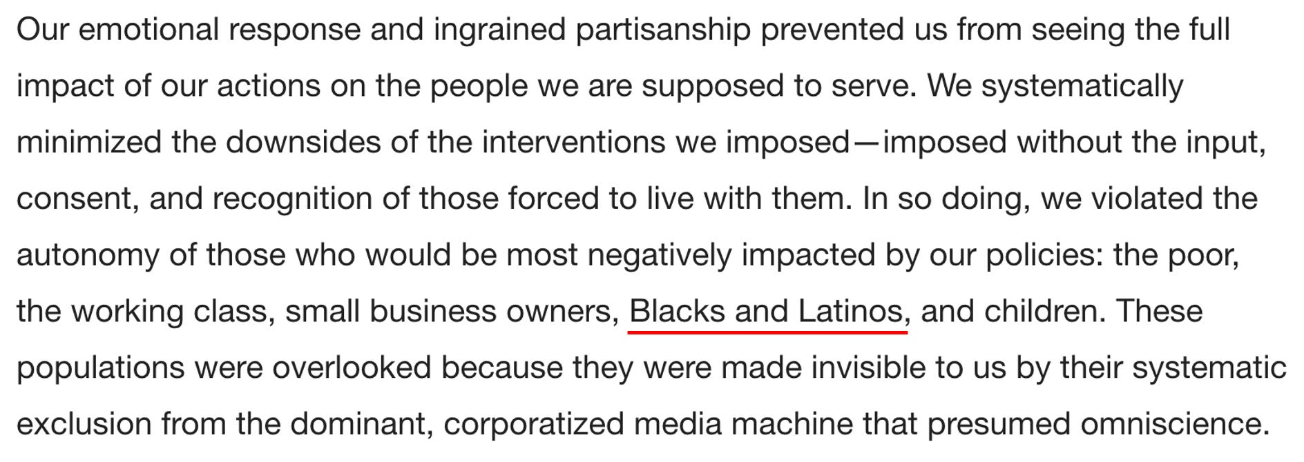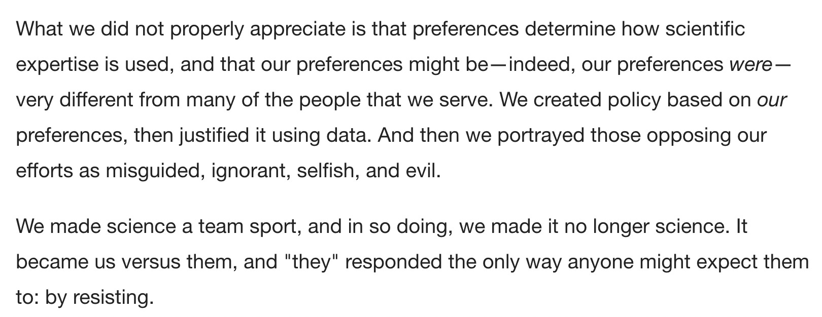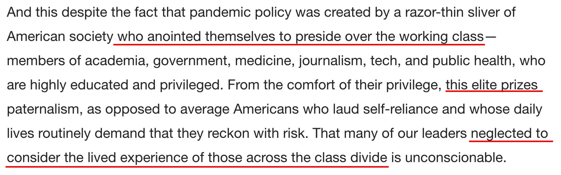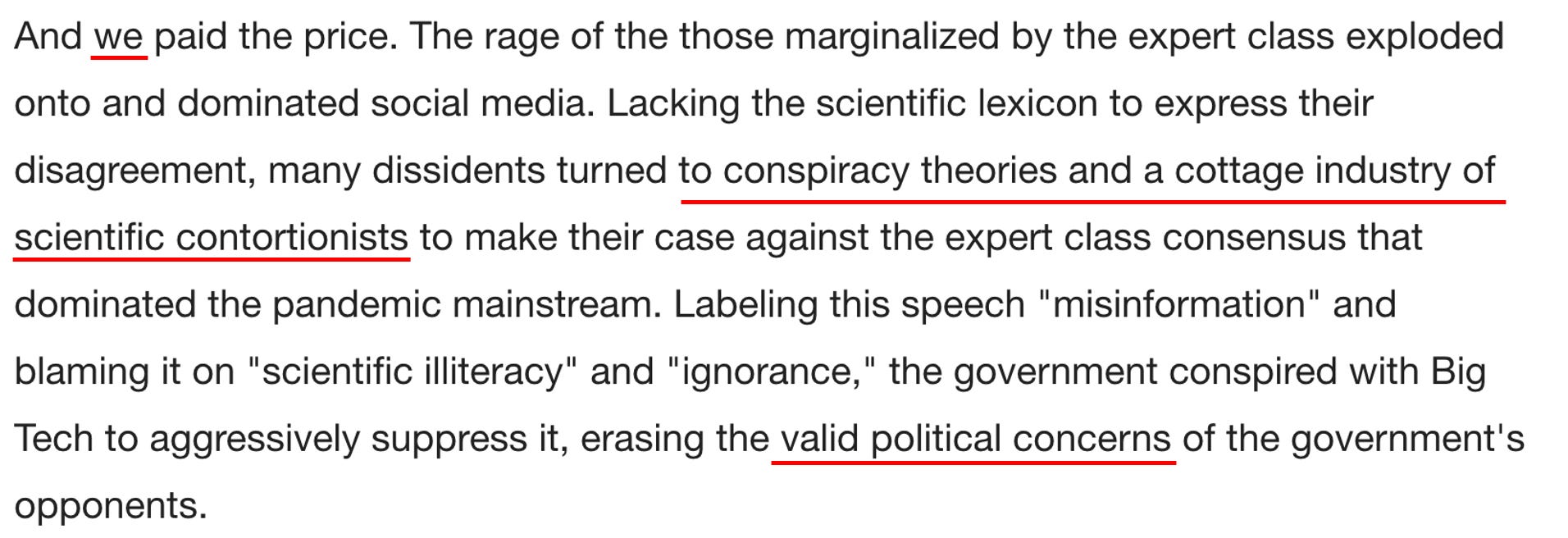 Before we go any further, I want to be clear that this piece, like Oster’s (who was also not a doctor), was primarily written for an educated liberal audience (hence why it uses so many of the academic constructs they love). I believe the goal of this piece is to test out soundbites that could be used to address the major issues that the medical establishment has created for itself as a result of how it handled COVID-19. The goal essentially is to have their cake (say something nice that makes everyone happy) and eat it (not have to actually admit what they did wrong or relinquish any of their power by changing the core problematic policies they put forward).