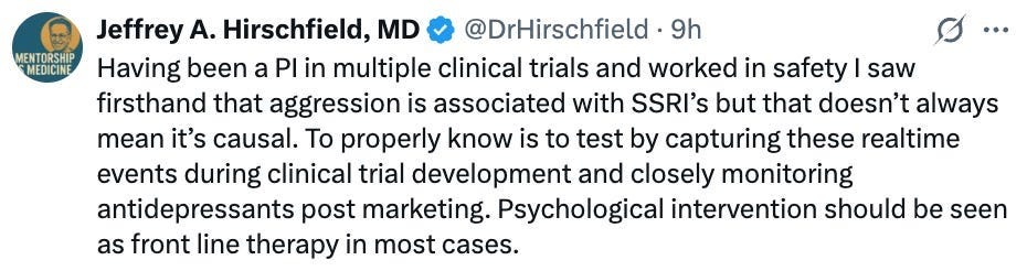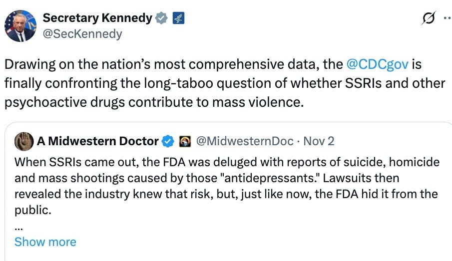 Sadly, as mentioned before, these issues are not unique to vaccines. For example, industry trials showed SSRI antidepressants cause violent behavior, suicide and homicide, but that data was never revealed until victim lawsuits forced it out through discovery. Secretary Kennedy, in turn, shared a post (seen by a million people) highlighting the decades of suppressed evidence SSRIs can cause violent behavior: