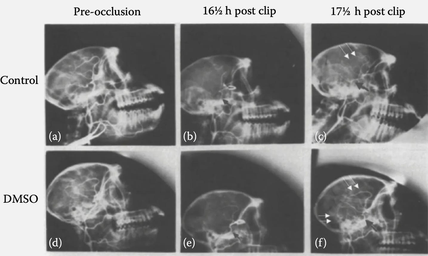 •A study surgically modified rat carotid arteries to significantly reduce the amount of blood going to their brain. After 3 months, it was found that DMSO prevented both the neuronal damage and the significant loss of spatial memory and learning that otherwise resulted from that chronic loss of cerebral blood flow.