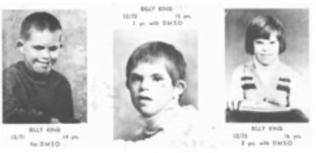 •At 14, Billy King could walk and feed himself but had the mental capacity of a ten month old. He then began drinking milk with DMSO each morning, and two years later, had the mental capacity of a seven year old and began losing the characteristic Down "Syndrome appearance.