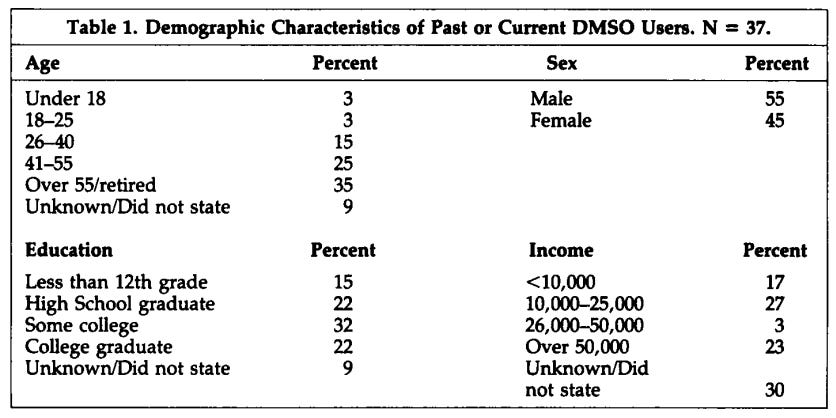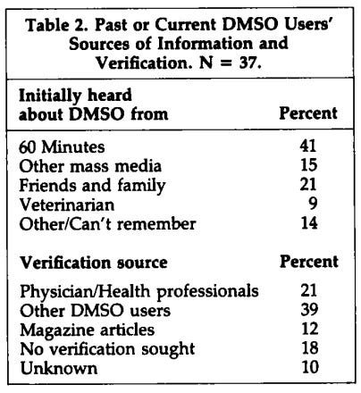 Thus, given the indifference or active opposition of most health professionals, many users started asking among their friends or relatives who had used DMSO, reading articles in papers or magazines or just using it without any verification or information. Those who felt that DMSO had helped them became in turn sources of information, and in a more than a few cases, active proselytizers. Some reported recommending it to up to a dozen people, including strangers who complained out loud in public places about aches and pains. Table 2 highlights the respondents' reports of their DMSO information and verification sources.