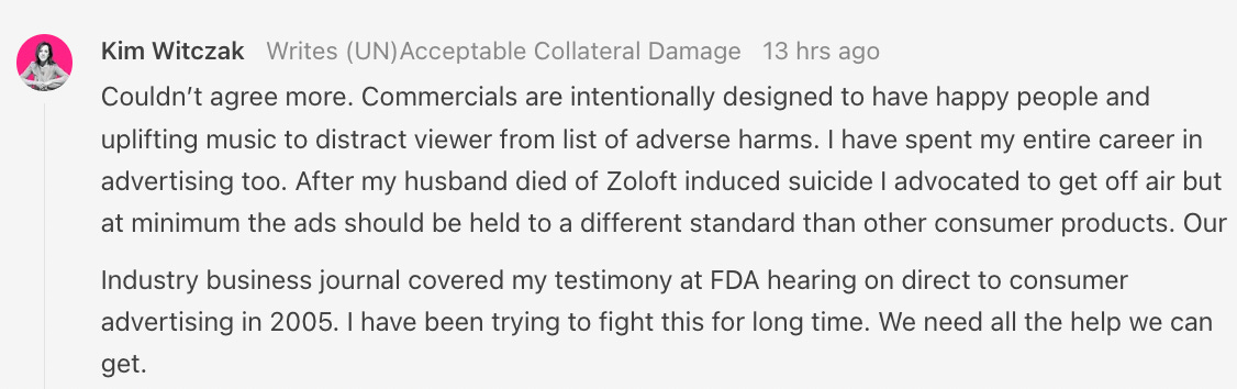 Note: in the last article I discussed how this was done (with the FDA’s tacit approval) throughout the SSRI clinical trials and likewise mentioned how a whistleblower disclosed that Pfizer’s trial was not blinded (which likely invalided the trial’s results), but after the FDA was notified, they did nothing except tell her supervisors (who promptly fired her).