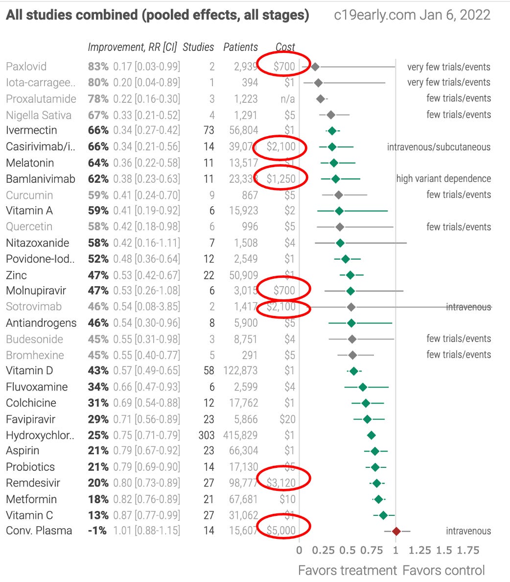Evidence based medicine is commonly thought to mean “the best evidence” dictates the standard of care. In reality, it typically means financial interests dictate the standard of care and “evidence” is just used as a smokescreen to justify profiteering. This table that I initially discovered from Kirsch’s article provides clear and unambiguous proof of that contention. See if you can figure out what the circled drugs (those which received an EUA) all have in common!