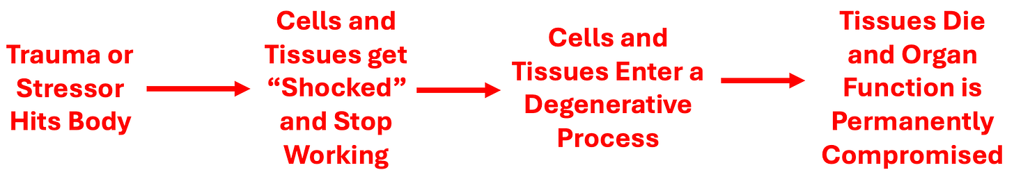 Frequently when cells receive a potentially lethal stressor, they will shut down their normal functions to survive and repair themselves. In many cases, this process is essential for survival, but in some cases, it instead becomes the root cause of disease because cells get stuck within the non-functioning state (a pathologic Cell Danger Response) or transition from being non-functional to dead (with these “penumbras” that later die being extremely common after strokes).