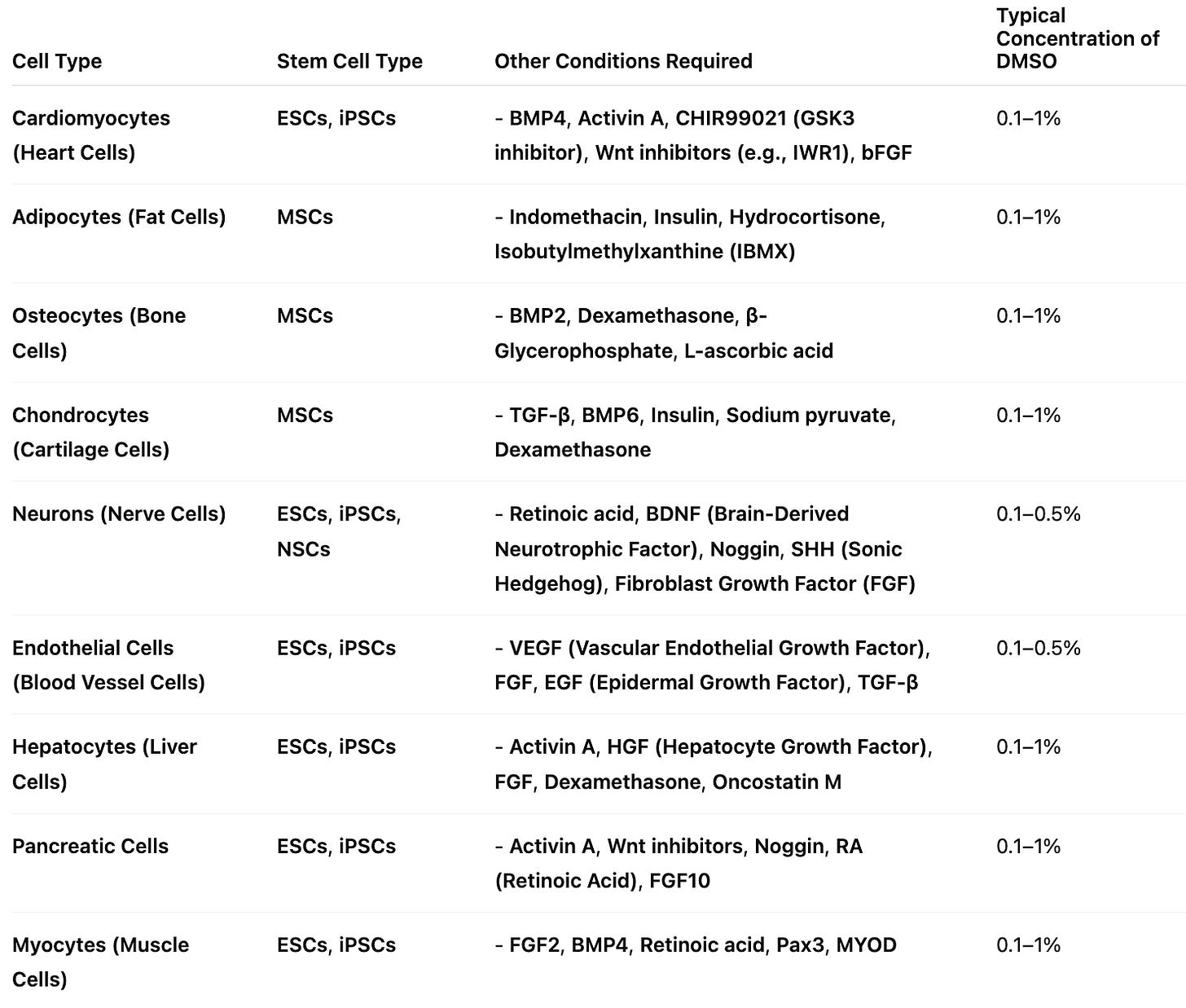 Likewise, since DMSO is a potent differentiation agent, it is frequently used in stem cell research to induce their differentiation into target cell types—which often requires DMSO in conjunction with an agent that already occurs in the tissue (as stem cells need something to guide them into transforming into the cell type each tissue needs). As so many paper have explored and validated this concept, rather than cite each of them, I’ll use an AI generate table to summarize some of the cell types DMSO has been observed to trigger differentiation in: