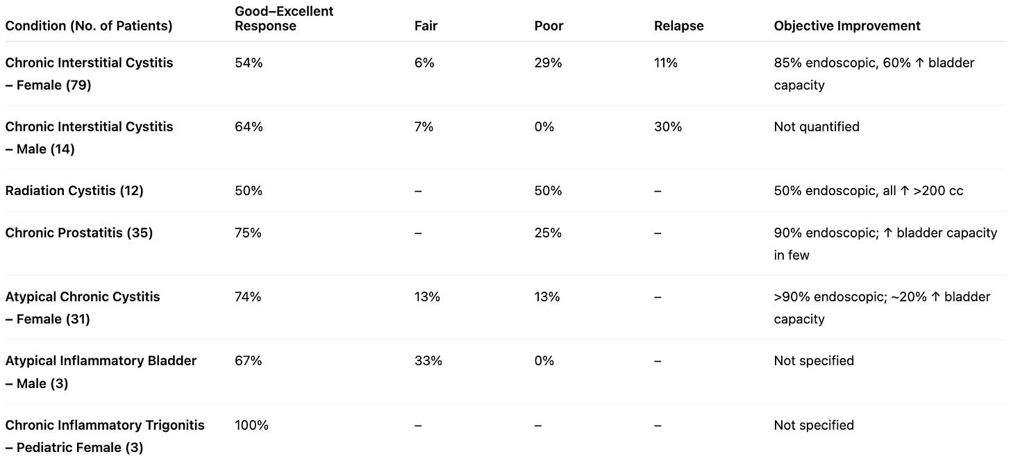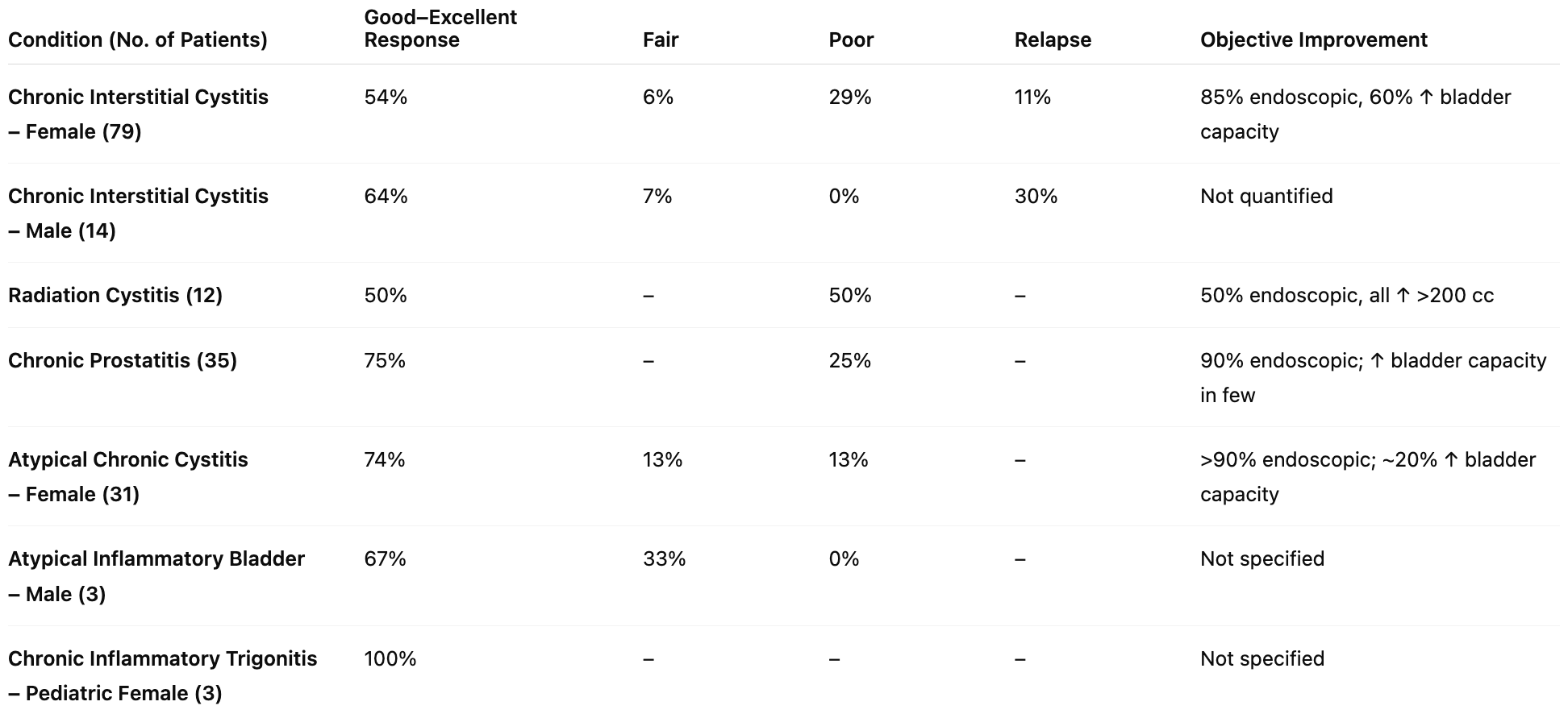 Of the 12 patients with radiation cystitis (e.g., from prostate cancer therapy) 50% had a positive response to it (3 “excellent,” 2 “good” and 1 “fair”).