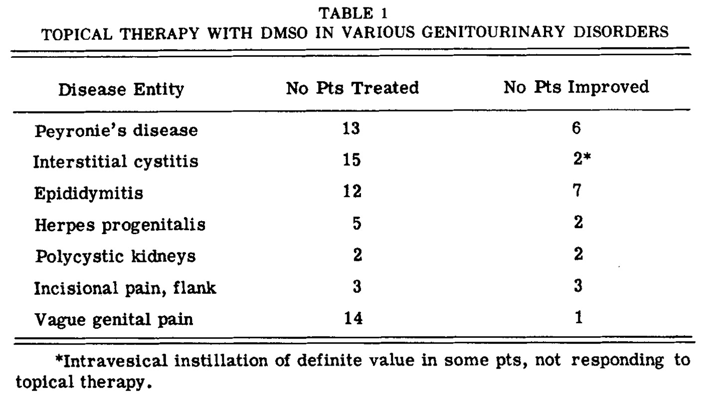 •Peyroine’s disease is a challenging disease where scar tissue builds up within the penis and gradually bends it, make intercourse uncomfortable for both parties (and due to reluctance by males to report it, estimates on its prevalence range from 0.3% to 16%). Due to the challenging nature of the condition (e.g., it’s a difficult area to operate on, and surgery will create more scarring) and the need for a treatment, the DMSO field immediately realized DMSO’s scar dissolving properties could be extremely helpful here. As such, numerous studies were conducted (detailed here) that showed DMSO offered remarkable benefits for about 50% of patients with the condition.1,2,3,4,5