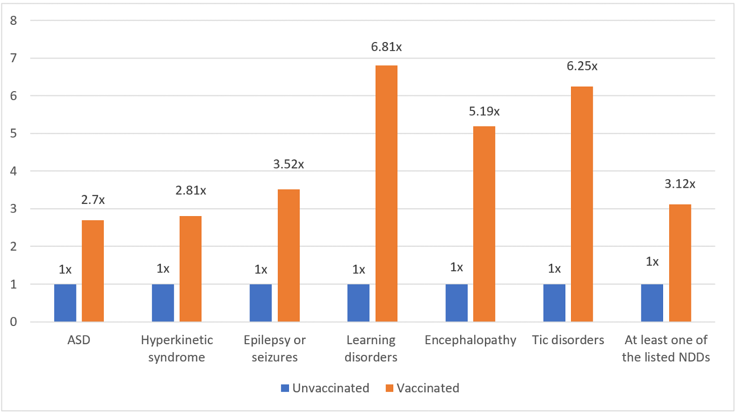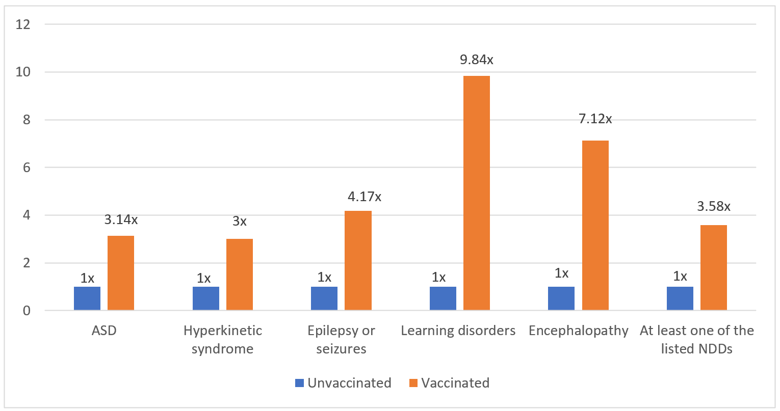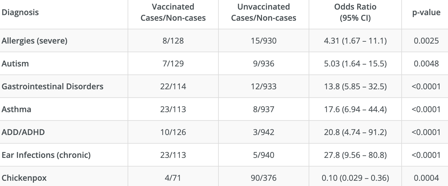 In that study, after after 10 years, 17% of unvaccinated children had a chronic health issue, while 57% of vaccinated children had at least one. In turn, vaccination dramatically increased the rates of many common chronic illnesses (e.g., allergies by 3.03X, asthma by 4.29X, autoimmune diseases by 5.96X ear infections by 6.63X, neurodevelopmental disorders by 5.53X and speech disorders by 4.47X) and autoimmune attacks (e.g., anaphylaxis by 8.88X and asthma attacks by 6.3X) while a wide range of neurological and psychiatric issues (e.g., ADHD, learning disabilities, or tics) were not seen in the unvaccinated whereas hundreds existed in the vaccinated cohort. The two key pieces of data from the study were as follows: