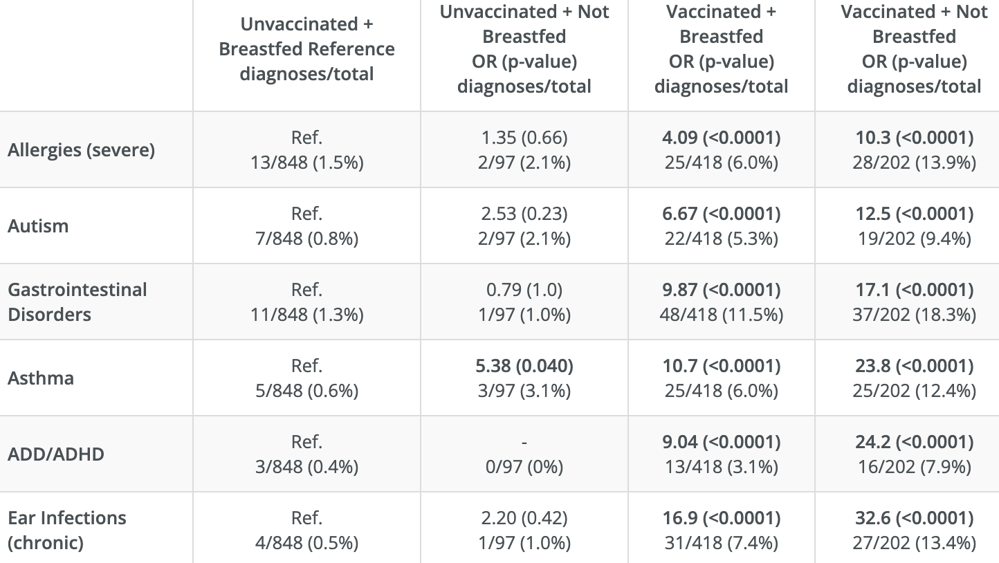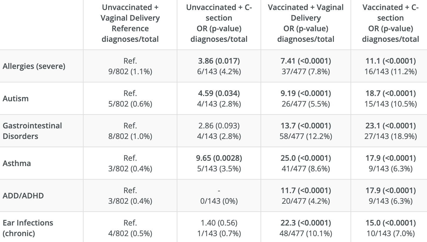 Furthermore, in that study, the greatest rates of these illnesses were seen in vaccinated children who were not breastfed or were delivered by cesarean section (both of which, as I show here and here, are linked to chronic illnesses, but as this study indicates, may be due to the fact that rather than cause them, they simply reduce one’s resistance to vaccine injury.
