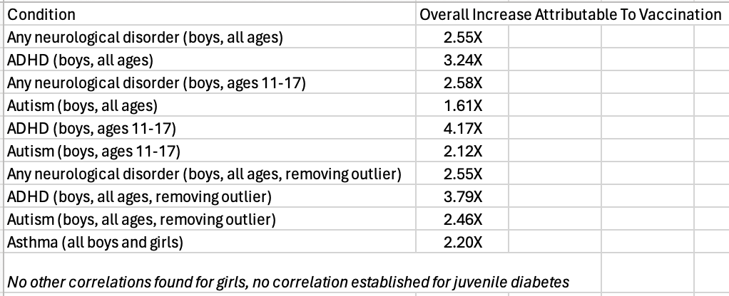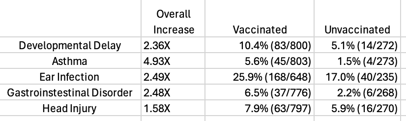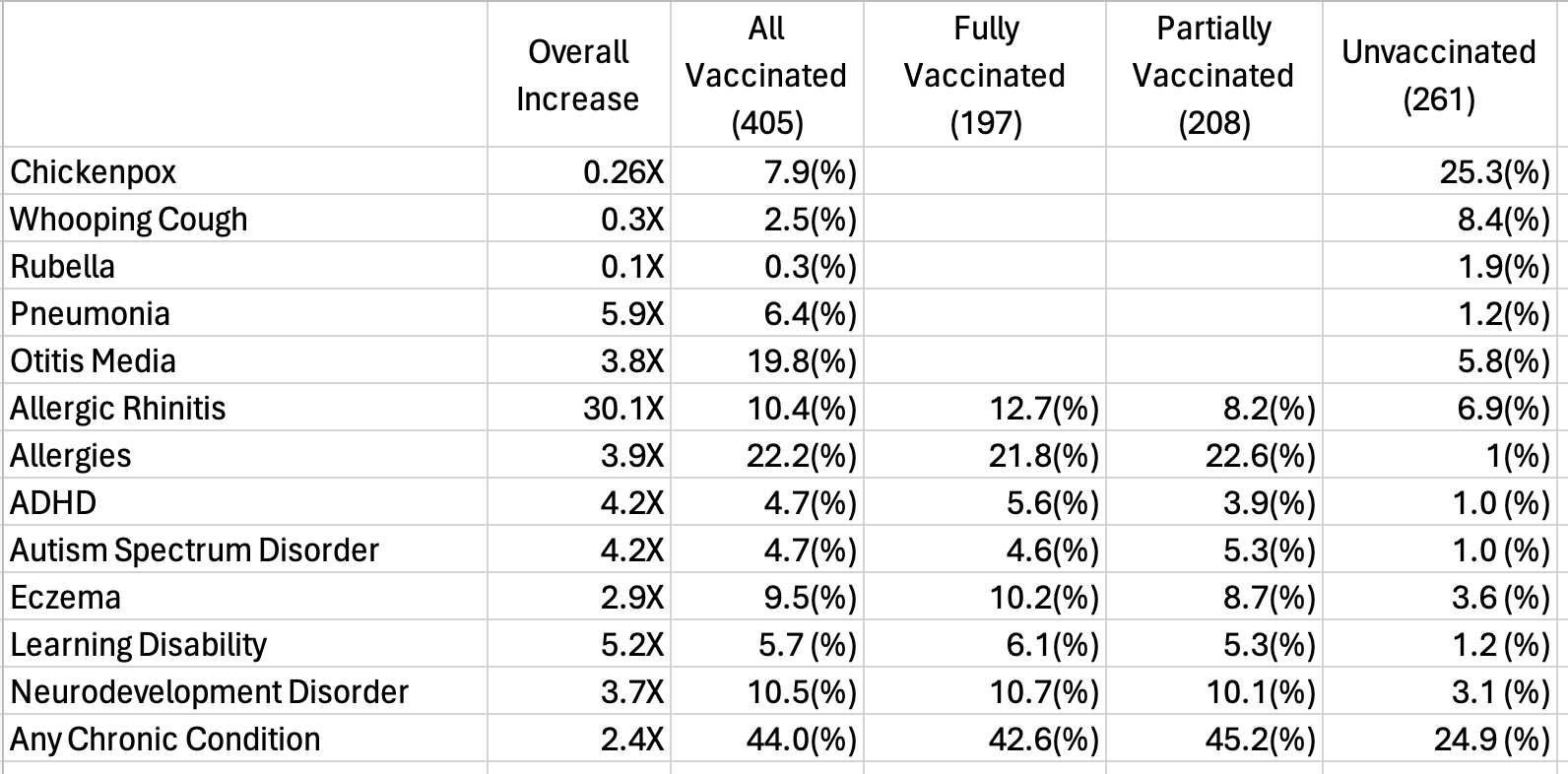 Note: the above chart only compares the children within the sample who were at least 5 years old. When younger children were compared to each other, smaller increases were seen in the rates of each of these chronic diseases as there had been less time for the chronic effects of repeated vaccinations to manifest.