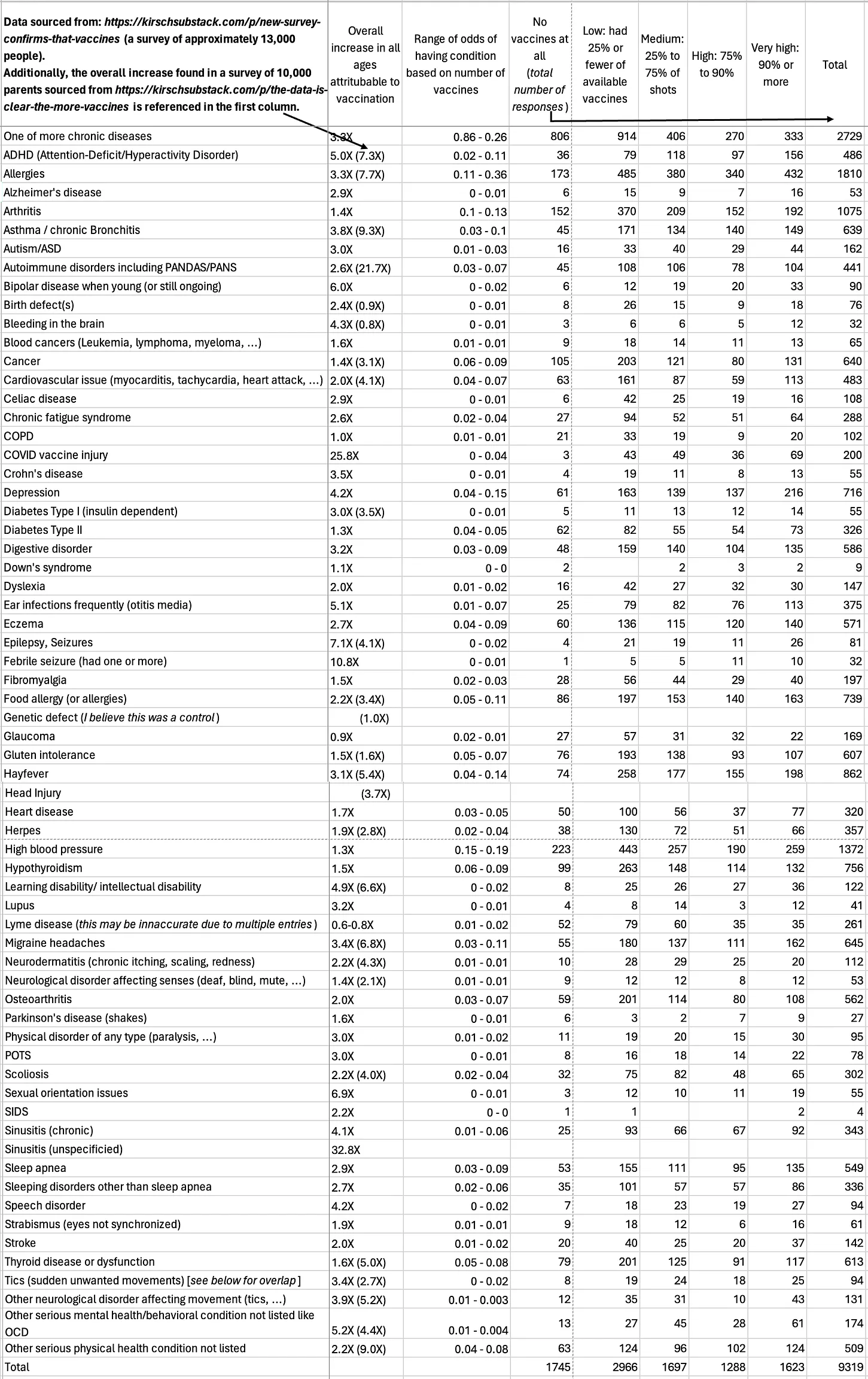 Because of his personality, Steve in turn had a revelation—if no one will give us the data we need about the vaccines I should just obtain it myself. In turn, beyond collecting every existing dataset demonstrating the harm of the vaccines (many of which I’ve reused here), he has also funded numerous professional surveys being conducted on the COVID vaccines (which all found between 8.6% to 16.4% of COVID vaccine recipients experienced significant harm from them, a rate similar to that of other independent surveys that were also conducted).
